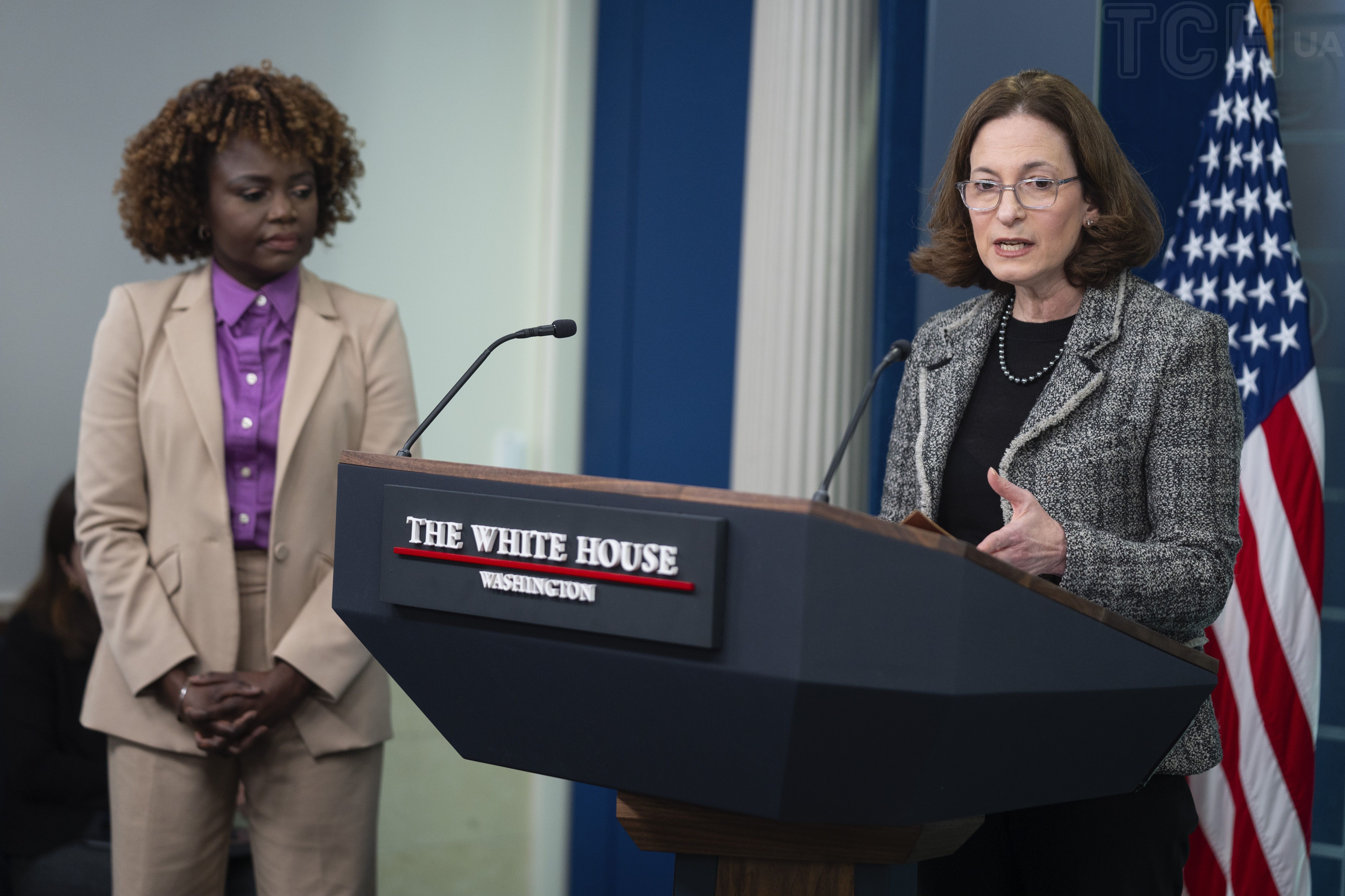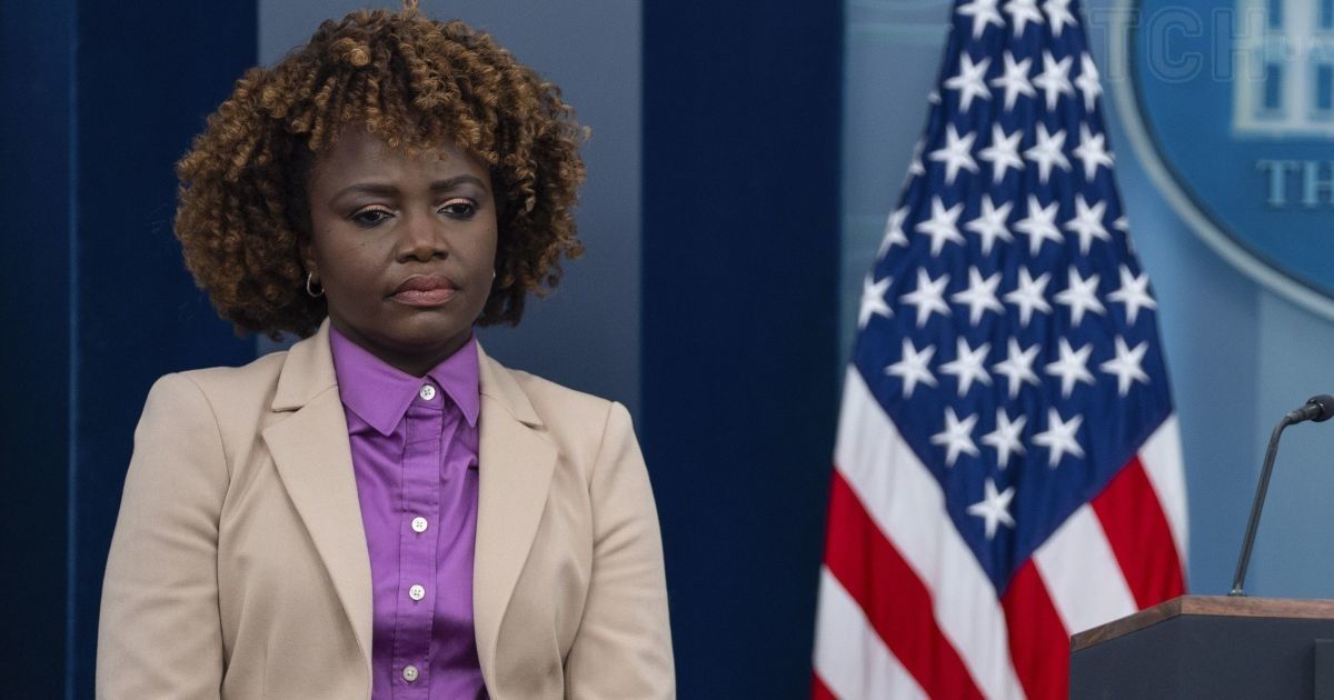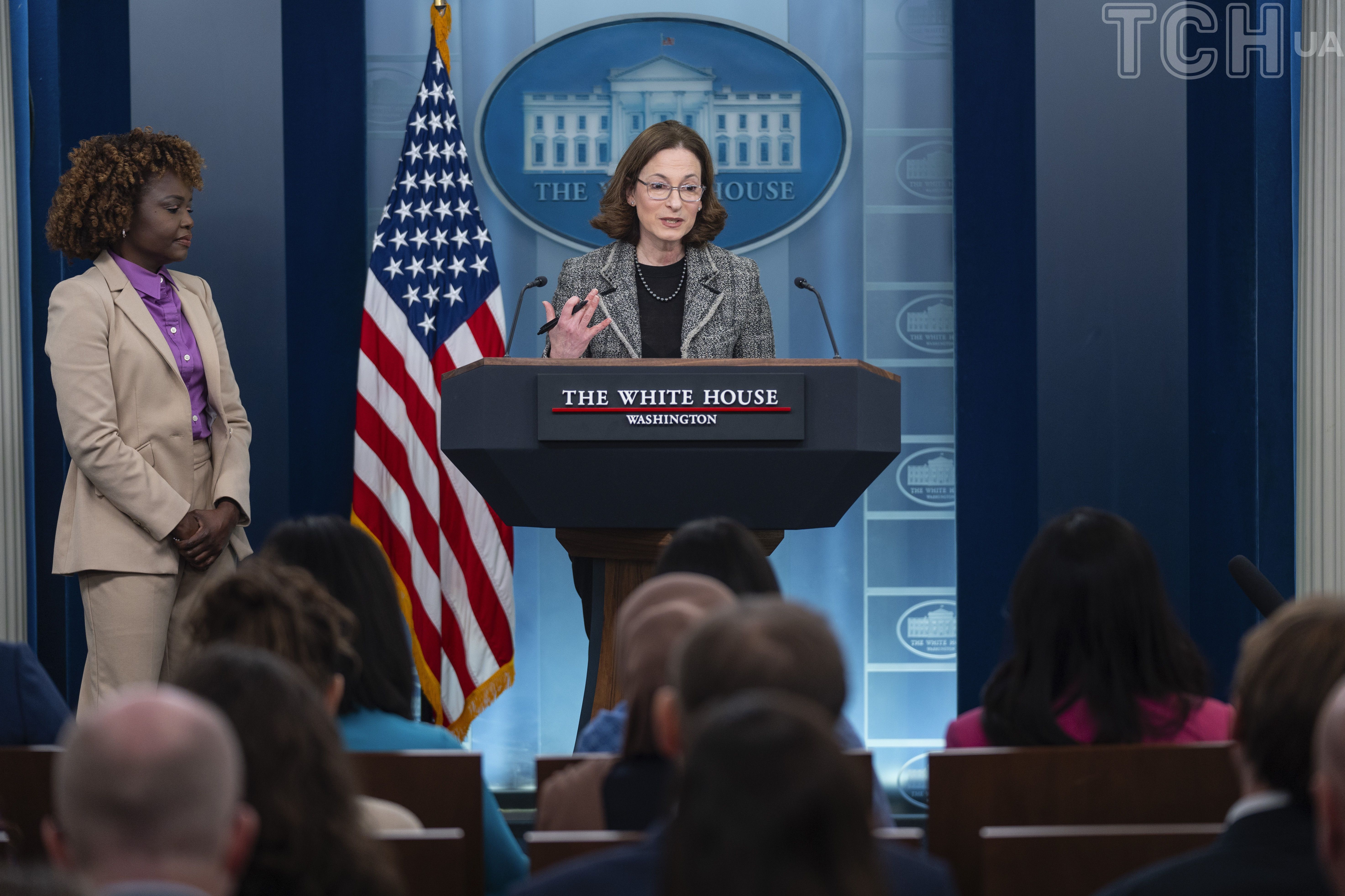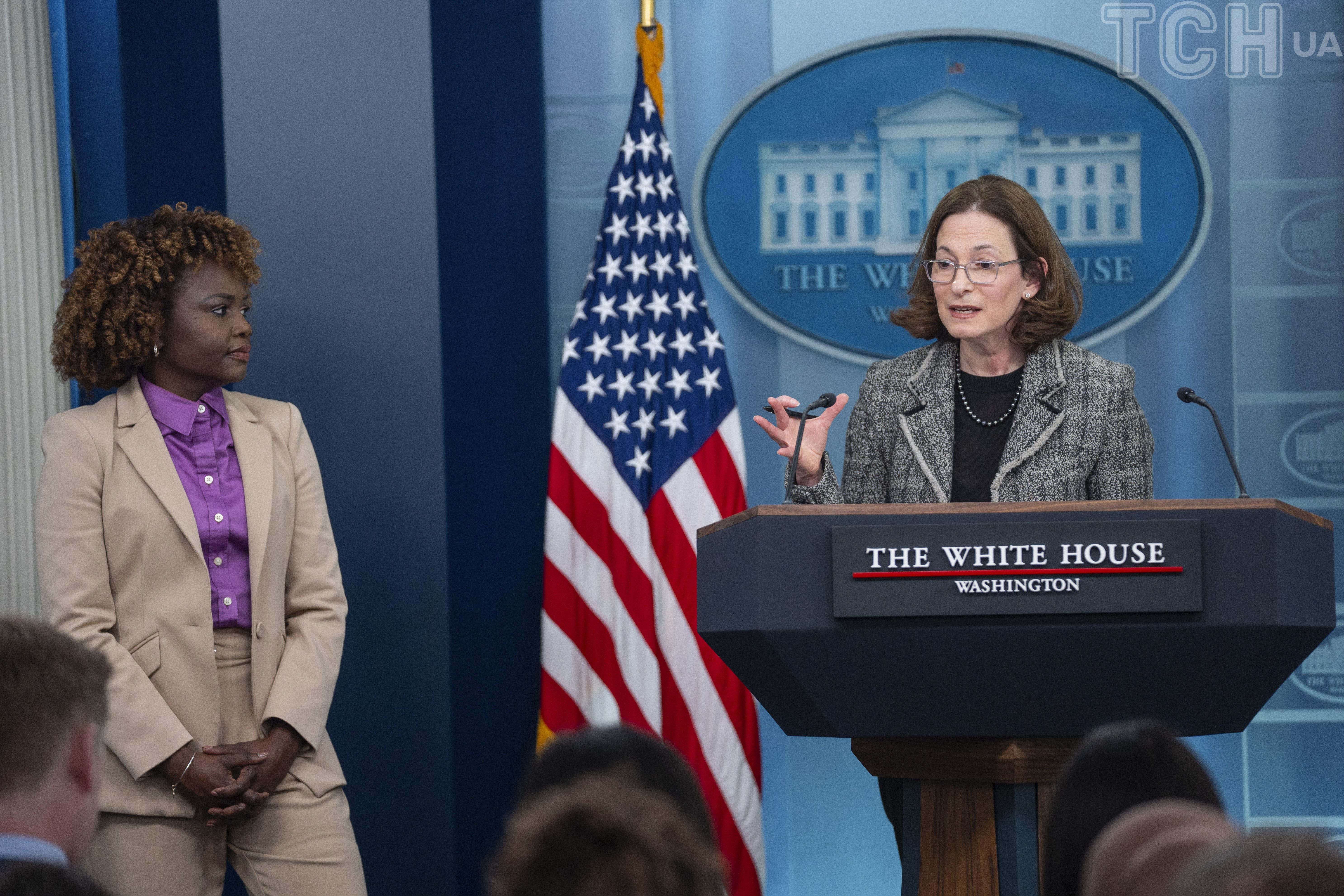 У бузковій сорочці і штанному костюмі: прессекретарка Байдена виступила перед журналістами