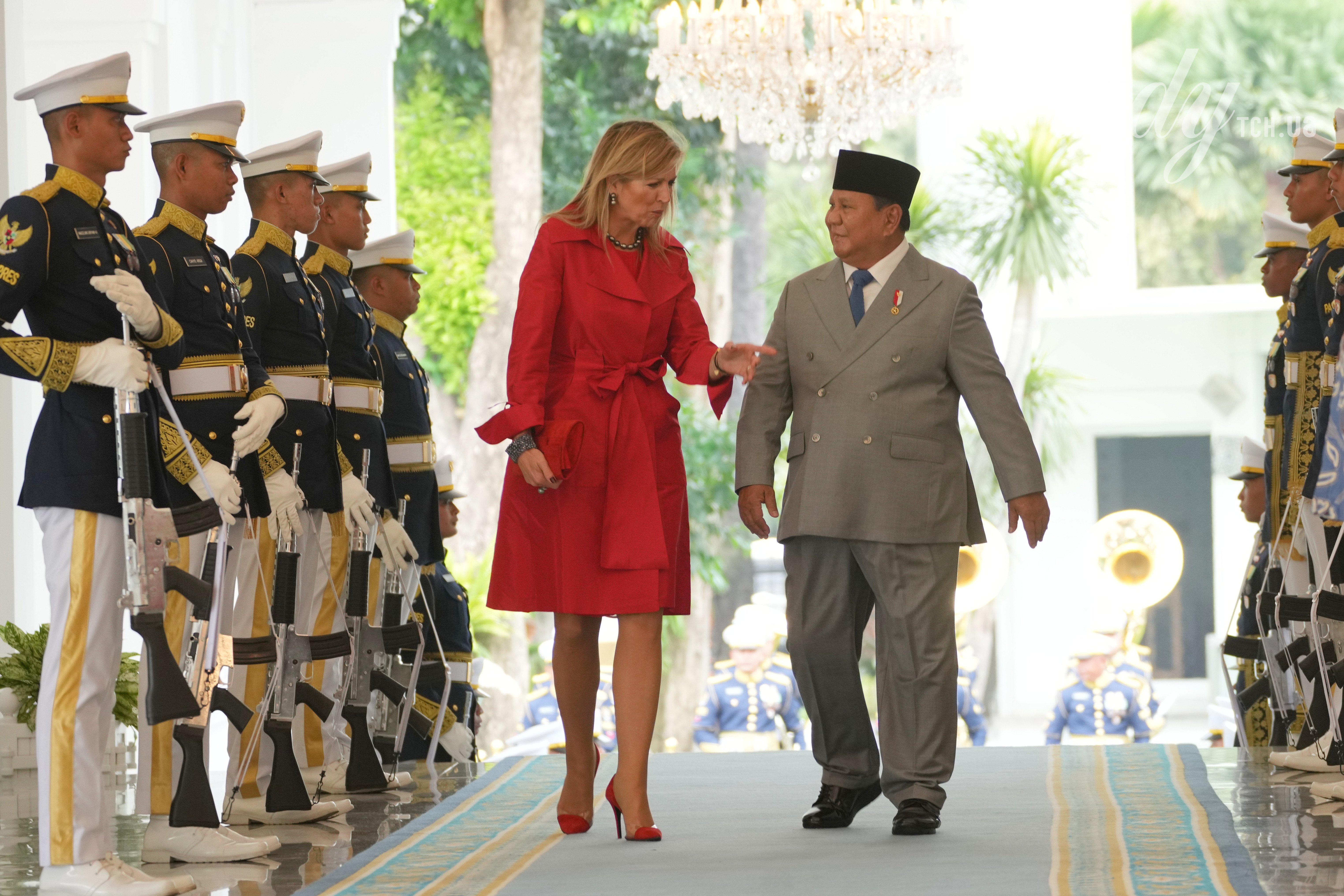Її Величність королева зустрілася з президентом Індонезії Прабово Субіанто після прибуття на зустріч у Палаці Мердека у Джакарті.