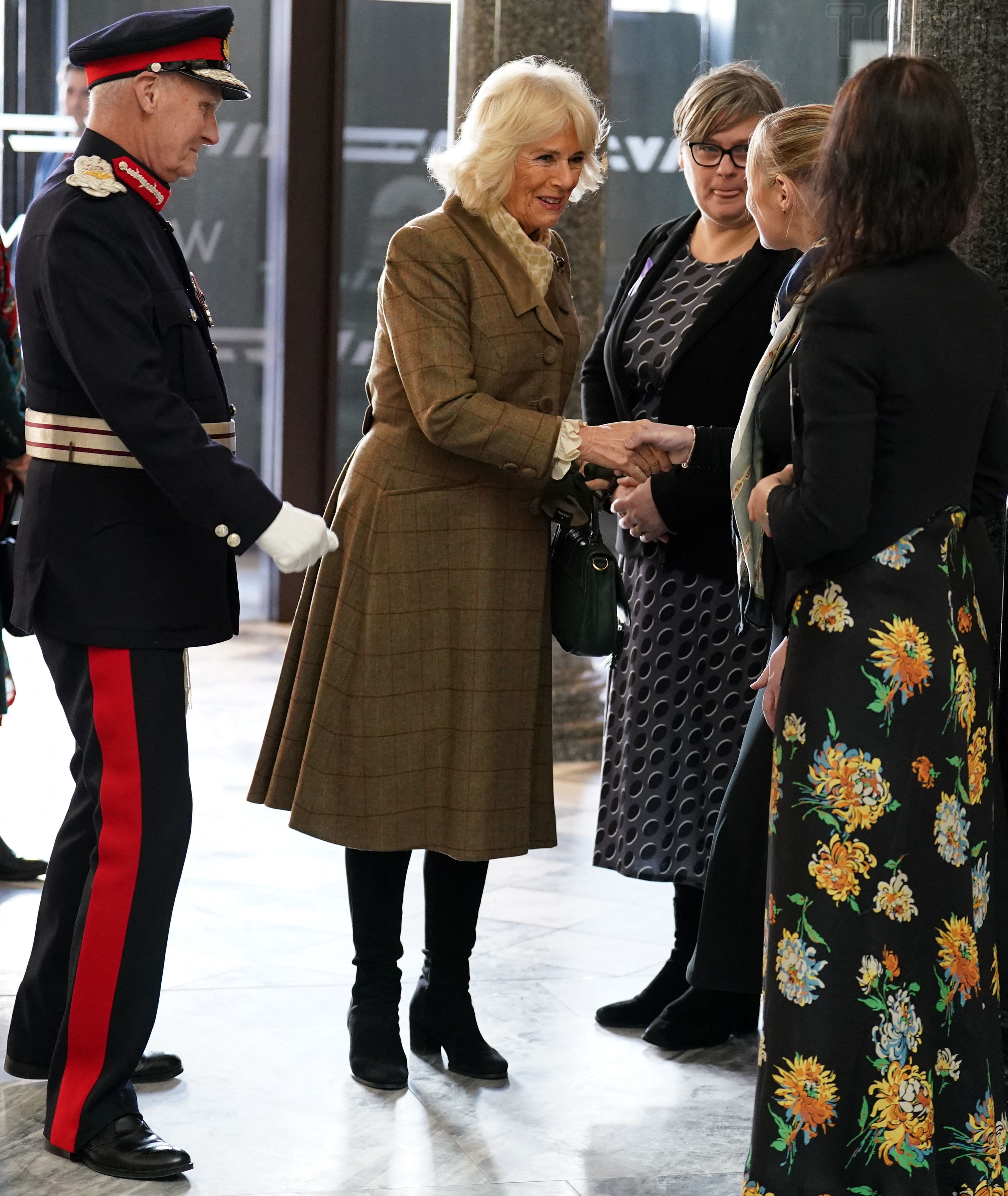 До Абердіна королева Камілла прибула в картатому пальті Roy Allen, взута у високі замшеві чоботи Russell & Bromley на підборах, а в руках у неї була сумка DeMellier (така ж є в гардеробі герцогині Сассекської Меган).