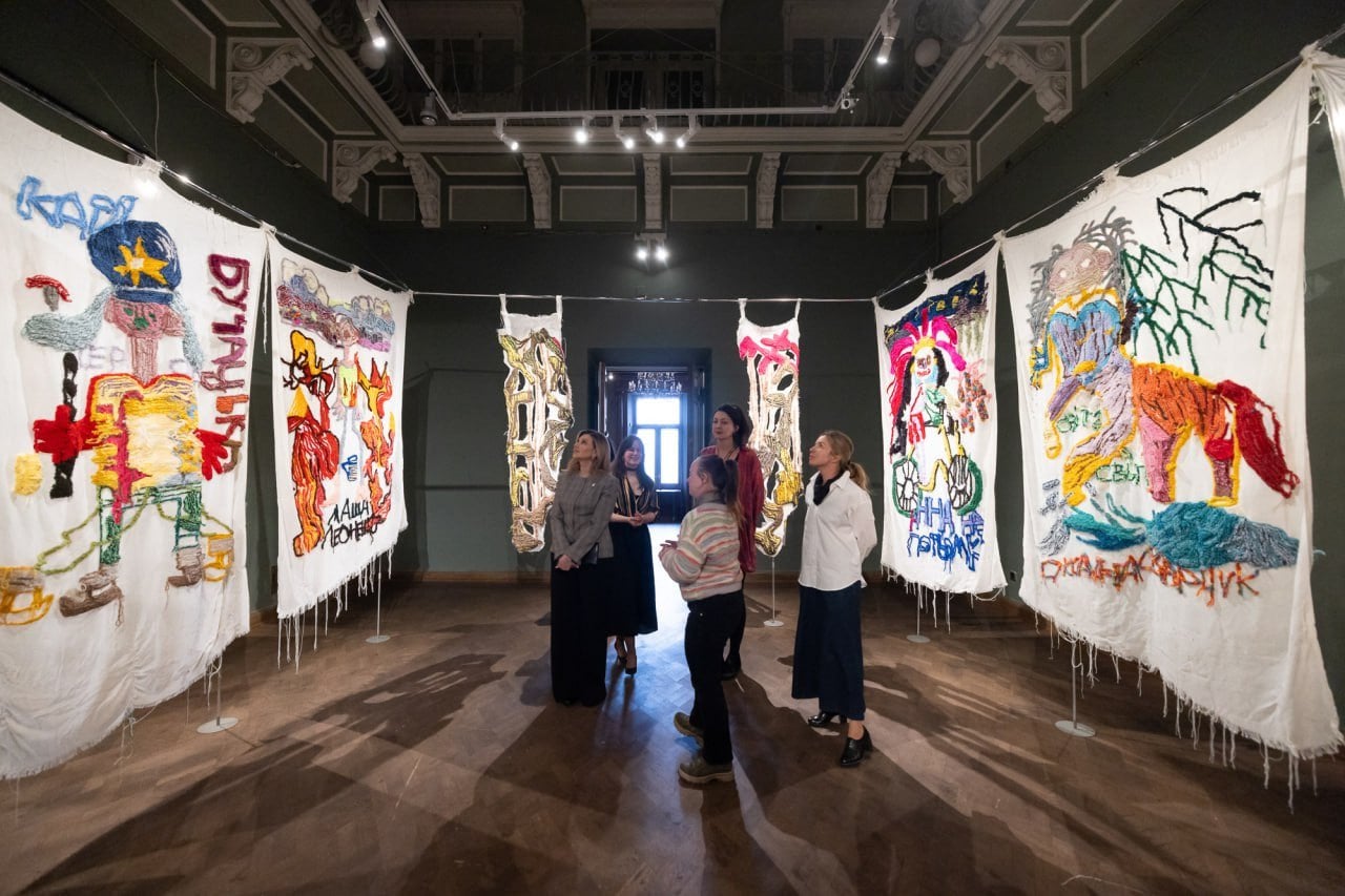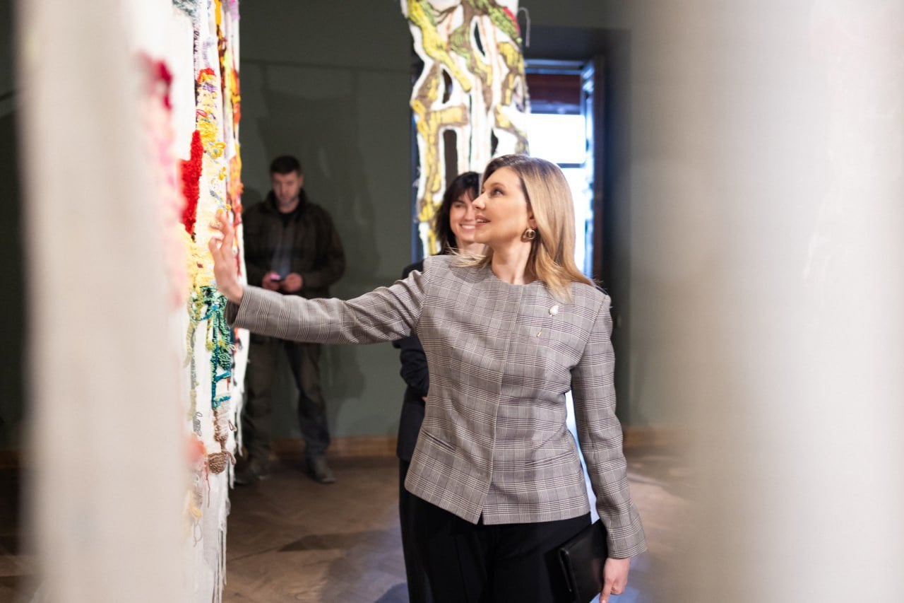 Перша леді ознайомилася з виставкою, в якій представлено 11 килимів мисткині, графічні малюнки, есеї та скульптурні інсталяції 2020–2025 років.