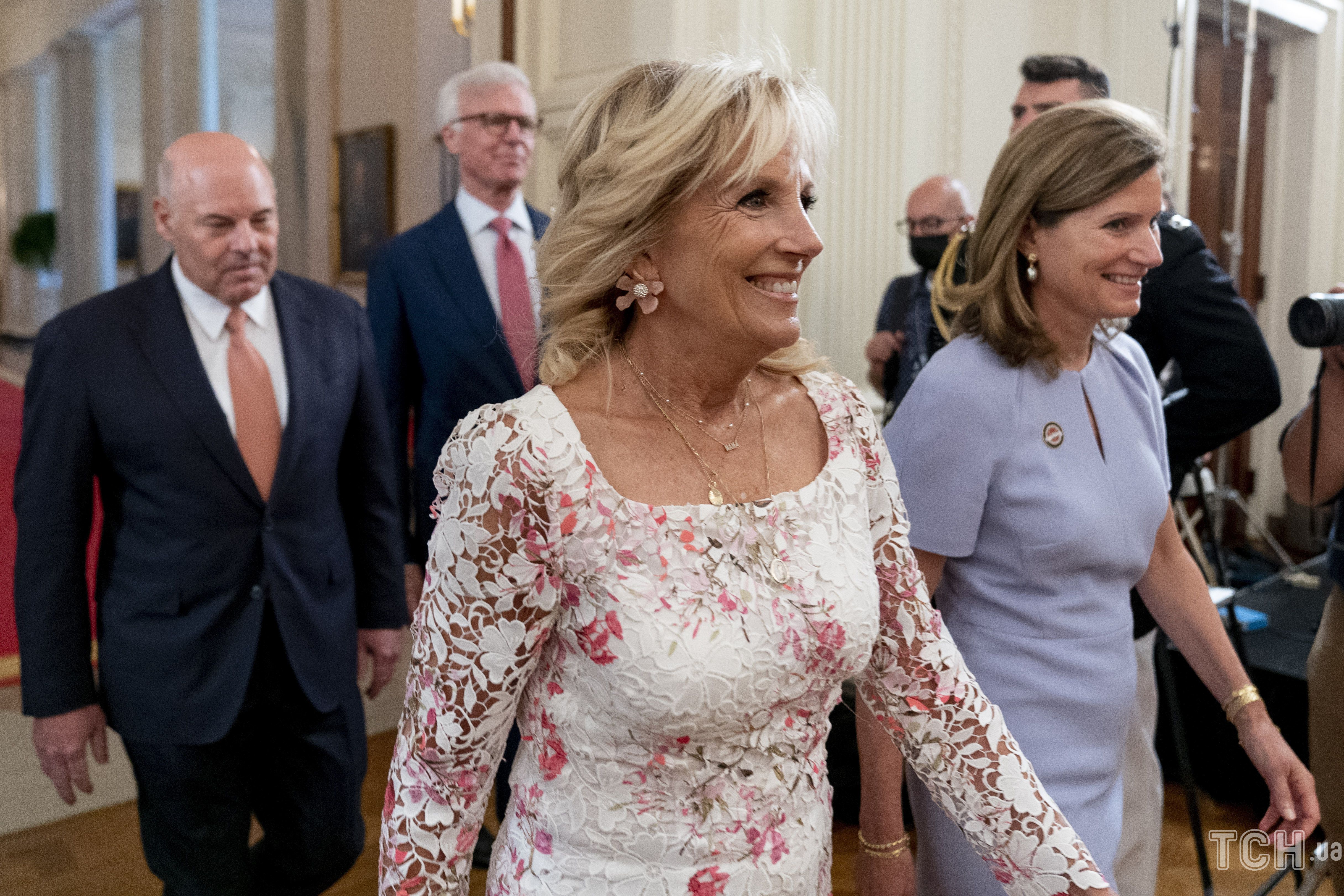 Перша леді США мала прекрасний вигляд. На ній була обтисла мереживна сукня білого кольору із червоними вкрапленнями. Вбрання чулово сиділо на фігурі Джилл.