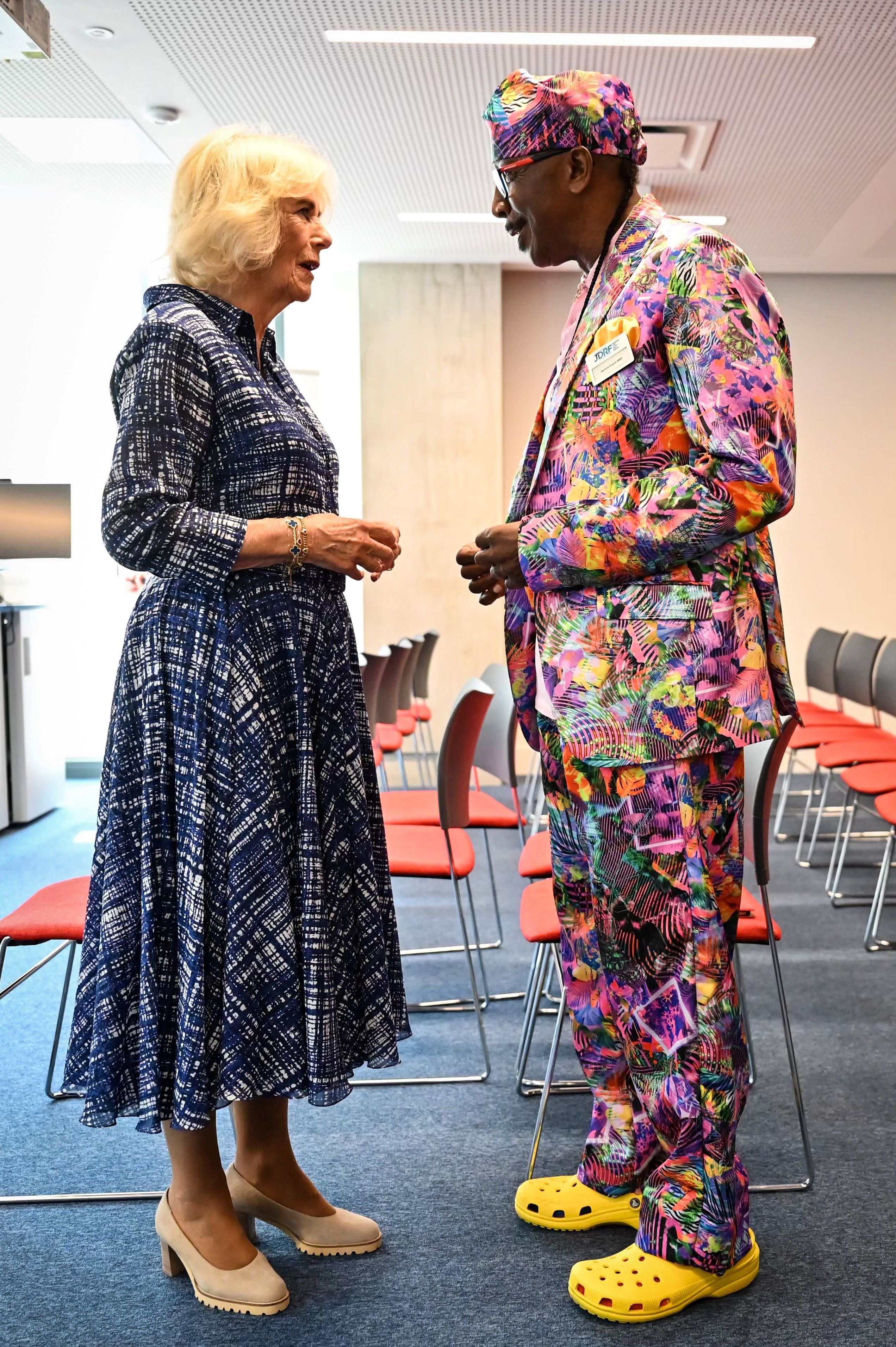 Камілла була в довгій двокольоровій сукні від Samantha Sung і взута в бежеві замшеві туфлі-човники від Eliot Zed. З прикрас на королеві був знову її улюблений браслет від Van Cleef & Arpels, заручальна каблучка та обручка, кілька золотих ланцюжків з підвісками на шиї. Зачіска у королеви Камілли була класичною, а макіяж денним.