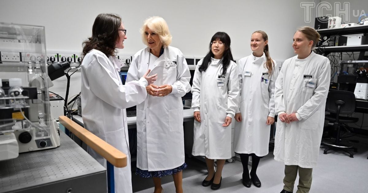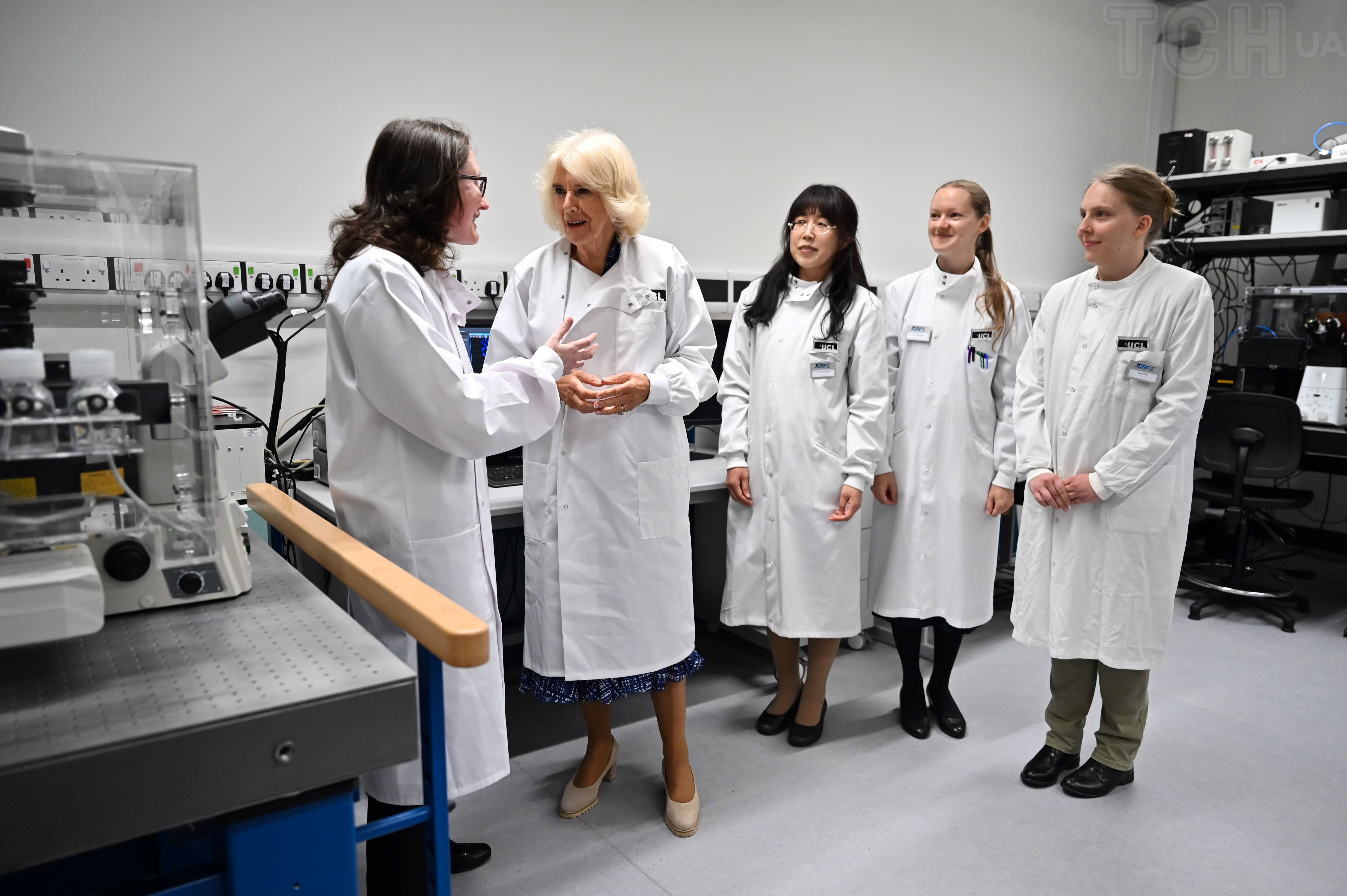 Її Величність зустрілася з професором імунного регулювання Інституту імунітету та трансплантології Університетського коледжу Лондона Люсі Вокер під час відвідин лабораторії, яка спеціалізується на розробці нових підходів до вивчення множинних аутоімунних захворювань у Королівській безкоштовній лікарні в Гемпстеді.