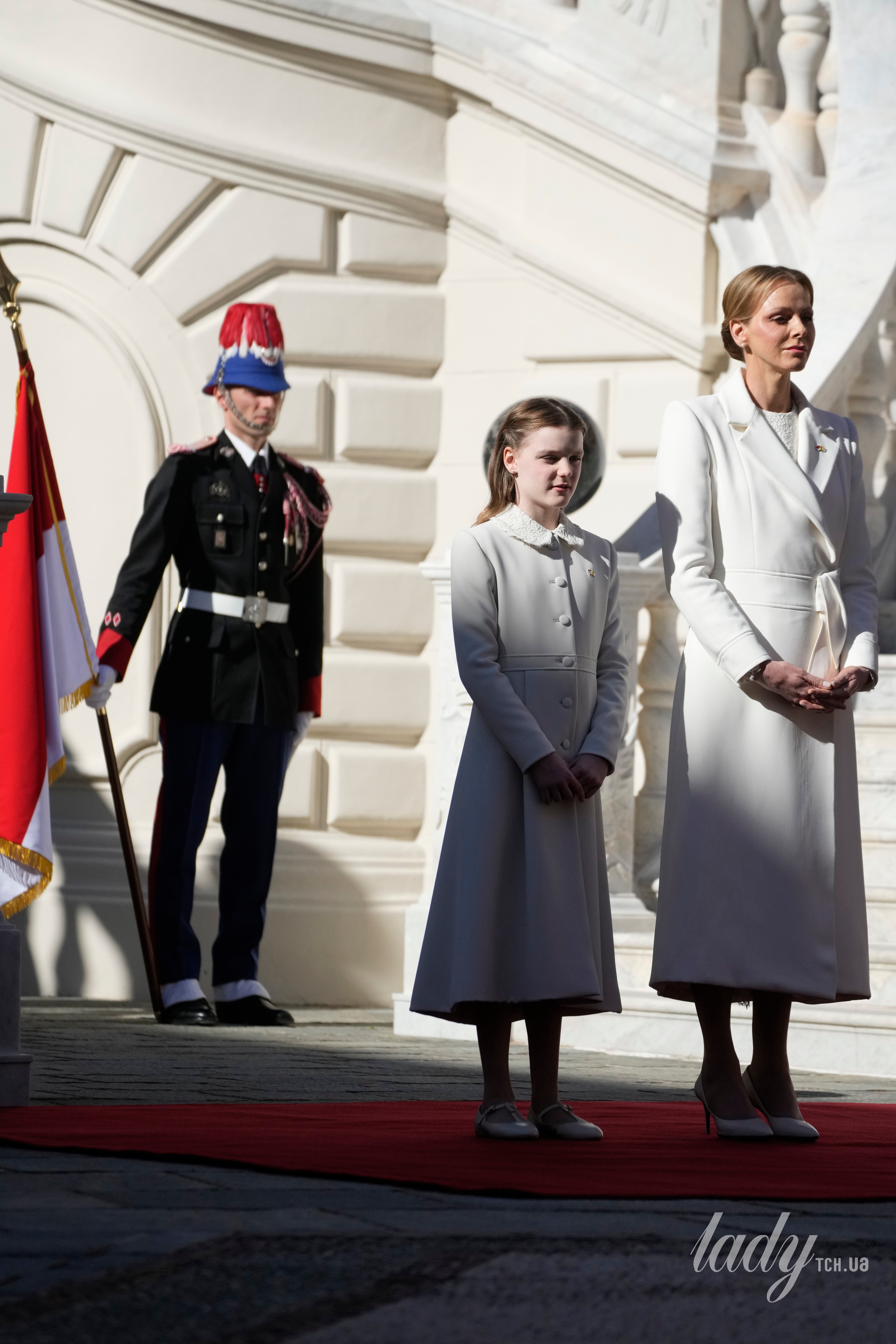 Її дочка принцеса Габріелла також була у білому вбранні — пальті з мереживним коміром та балетках. А князь Альбер II та принц Жак були у класичних костюмах.