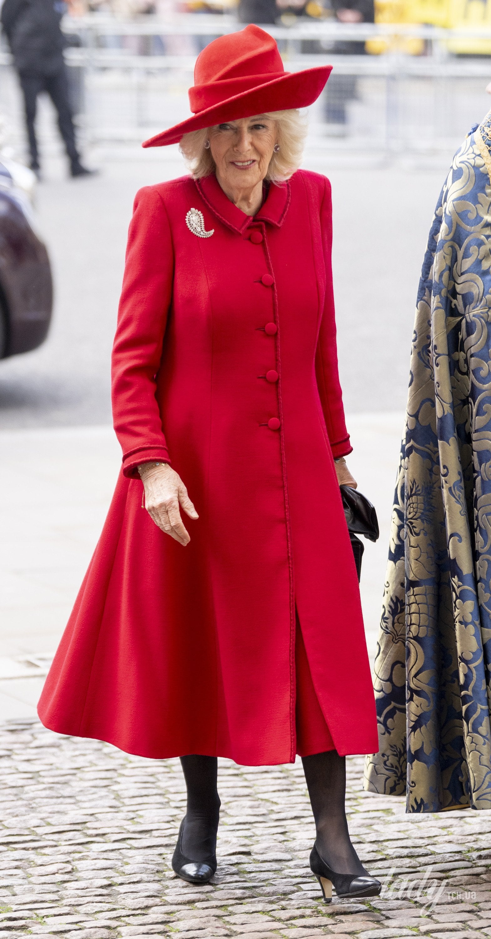 Зазвичай, служба проходить у другий понеділок березня в Лондоні. Очолювали її король Чарльз та королева Камілла, яка з’явилася на публіці у яскравому червоному пальті від Fiona Clare, до якого прикріпила розкішну брошку матері Єлизавети II від Cartier.