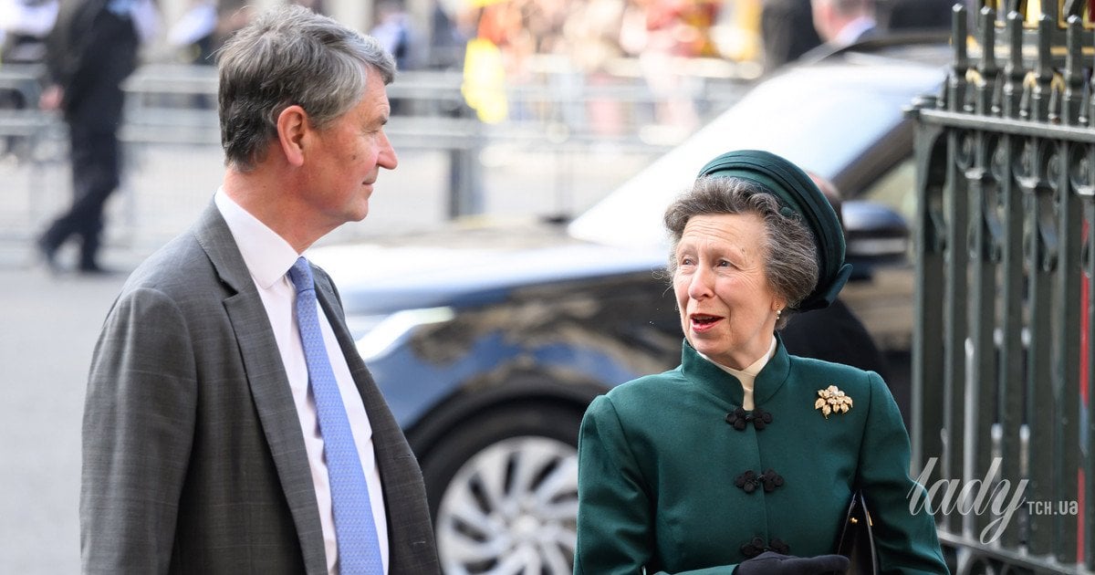 Принцеса Анна обрала елегантний образ у смарагдовому відтінку з коміром-стійкою і на чорних ґудзиках з квітами, доповнивши вбрання капелюхом відповідного кольору, перлинними сережками-вісячками та золотою брошкою, прикрашеною перлами.