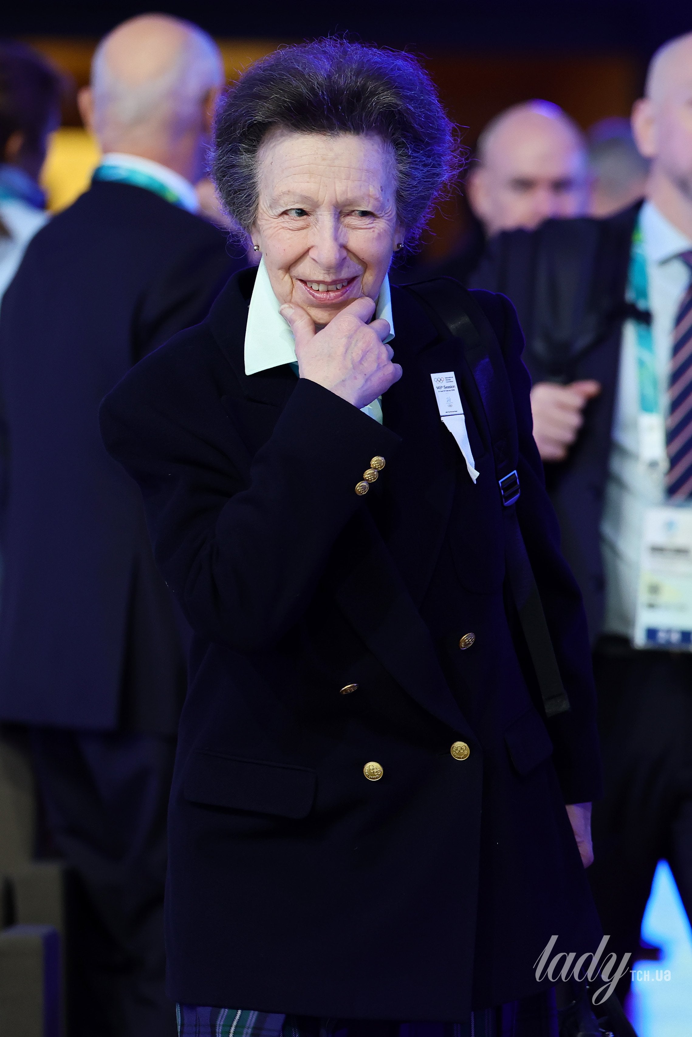 Сестра короля Чарльза з'явилася на зустрічі у діловому аутфіті — двобортному подовженому жакеті із золотими ґудзиками, білій сорочці та смугастих штанях. Вона зібрала волосся в класичну улюблену зачіску «вулик» і зробила легкий макіяж на обличчі, завершивши свій лук золотими сережками-цвяшками. Принцеса мала стриманий вигляд та усміхалася.