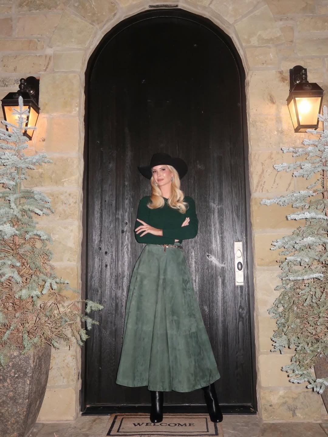 Бізнесвумен постала у темно-зеленому светрі і замшевій світло-зеленій спідниці міді А-силуету із золотим поясом-ланцюжком. Свій аутфіт Іванка доповнила чорним капелюхом і чорними шкіряними чоботами на підборах.