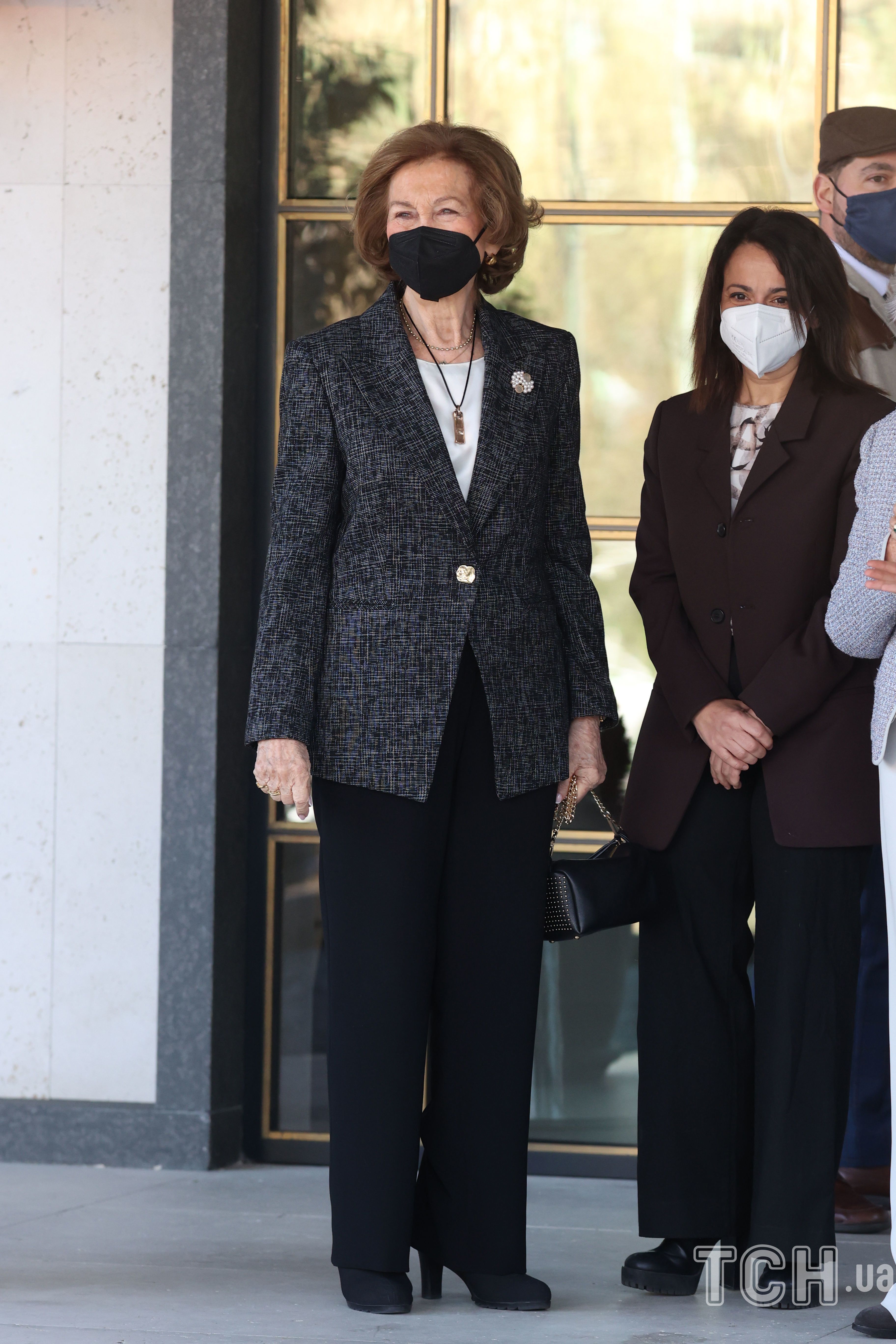 Софія одягла блискучий жакет відтінку металік і чорні широкі штани, до яких підібрала замшеві ботильйони на підборах, а в руках несла маленьку сумку-саквояж. У королеви був французький манікюр, на зап'ясті виблискував годинник і браслет, на шиї було намисто з каміння, а у вухах - сережки-кліпси з бірюзою. Софія зробила лаконічне укладання та макіяж, і була у захисній масці.