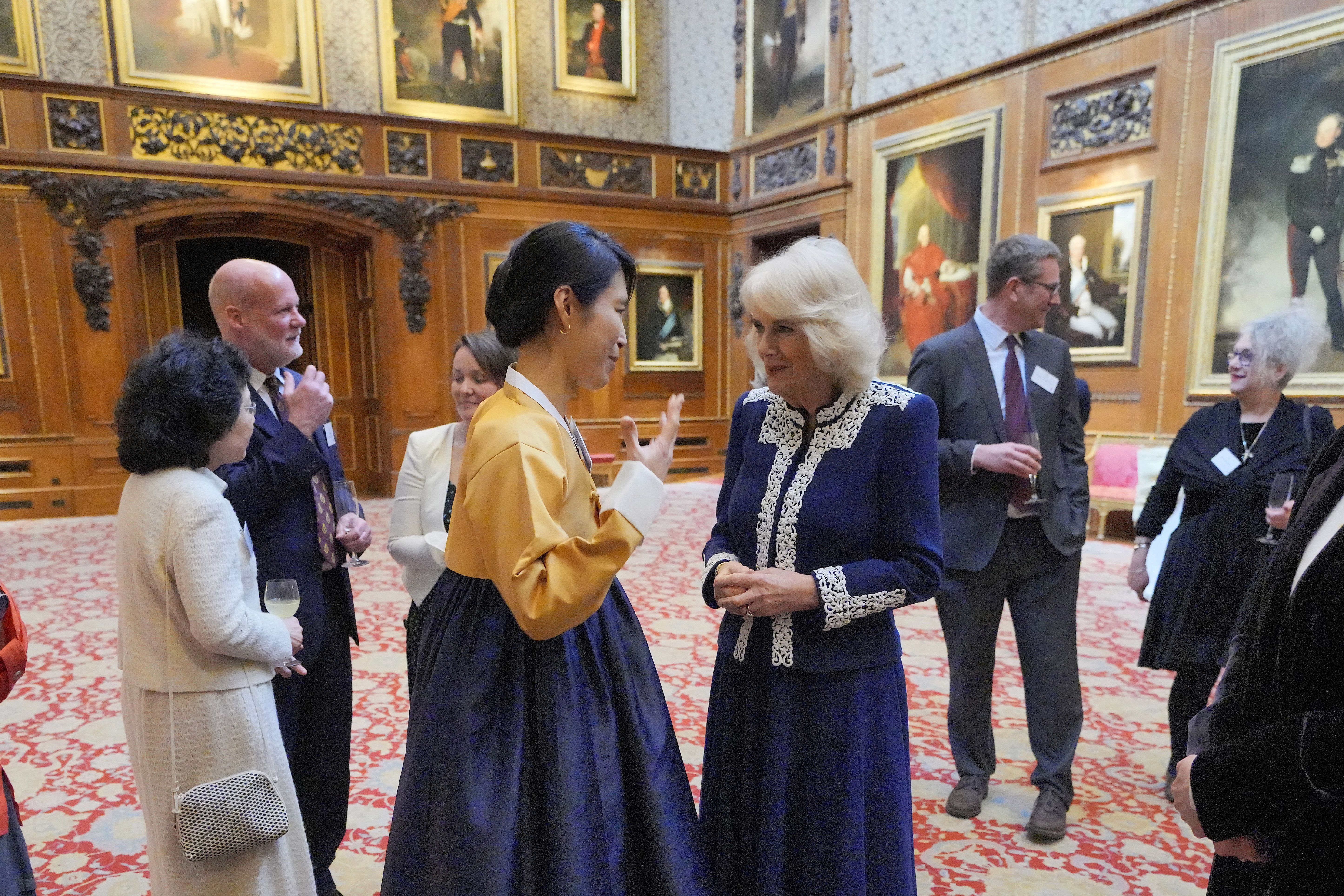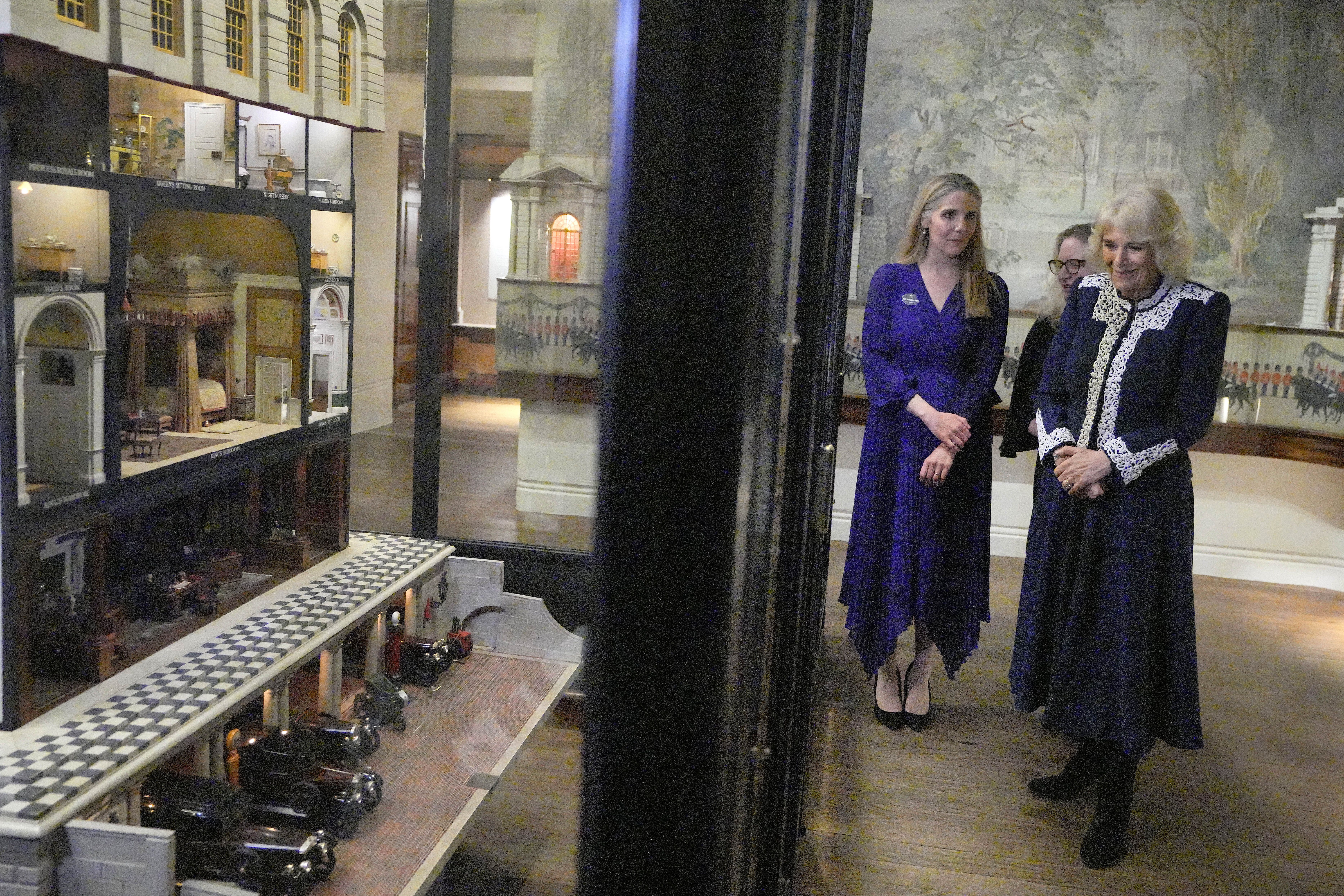 Королева Камілла приїхала на зустріч у темно-синьому жакеті з білою вишивкою та спідниці, а взула чорні чоботи із замші на невисоких підборах. Цього разу вона носила однакові перлинні сережки, кілька золотих підвісок на шиї з медальйонами на яких вигравірувані імена її онуків, а також кілька браслетів одягла на зап'ястя, прозорим лаком покрила нігті і зробила макіяж. На її пальці виблискувала заручальна каблучка з великим діамантом. А укладання було, як завжди, бездоганним.