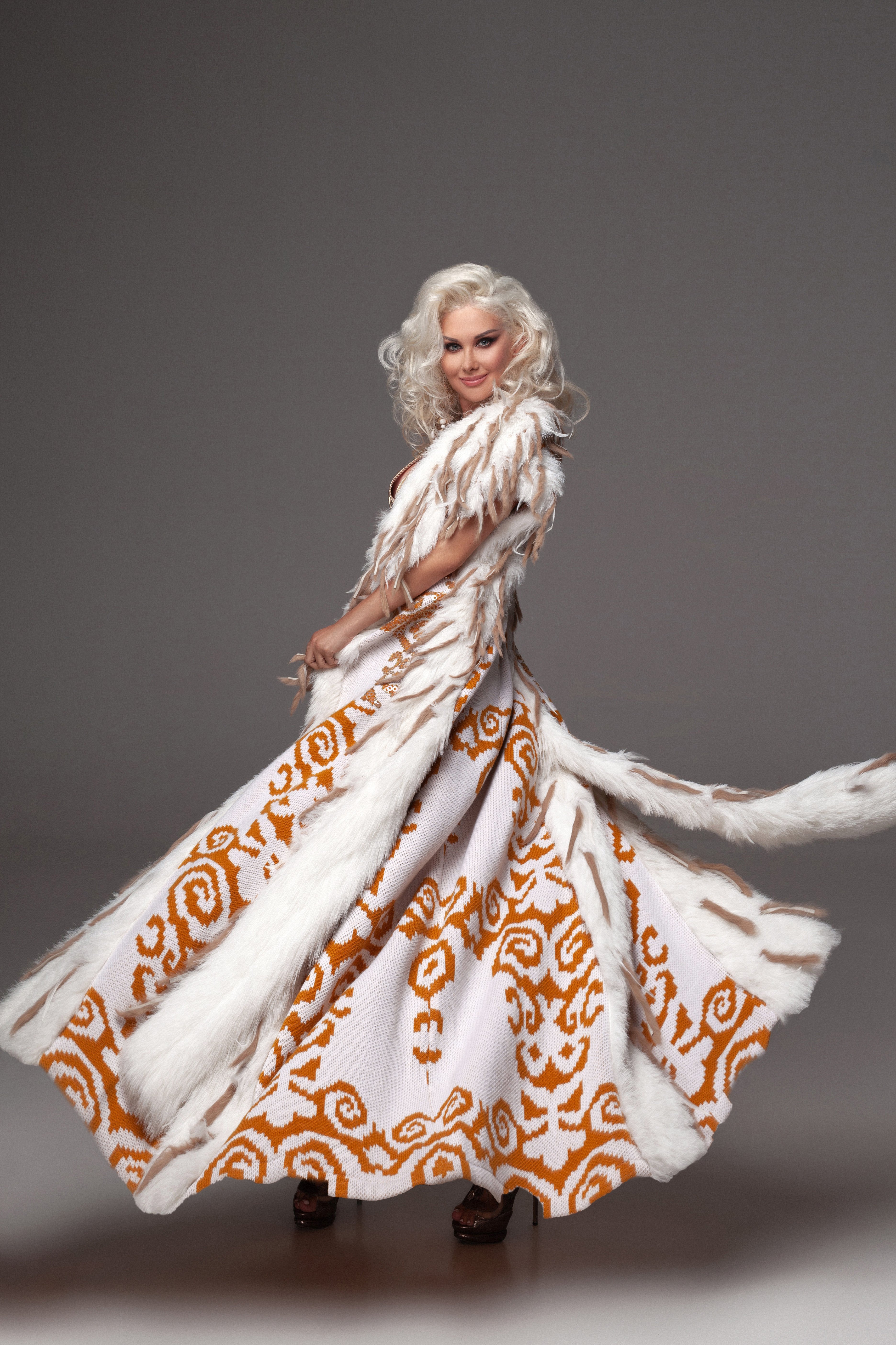 Артистка постала у довгому пальті-накидці з біло-бежевим екохутром і помаранчево-білим етнічним орнаментом.