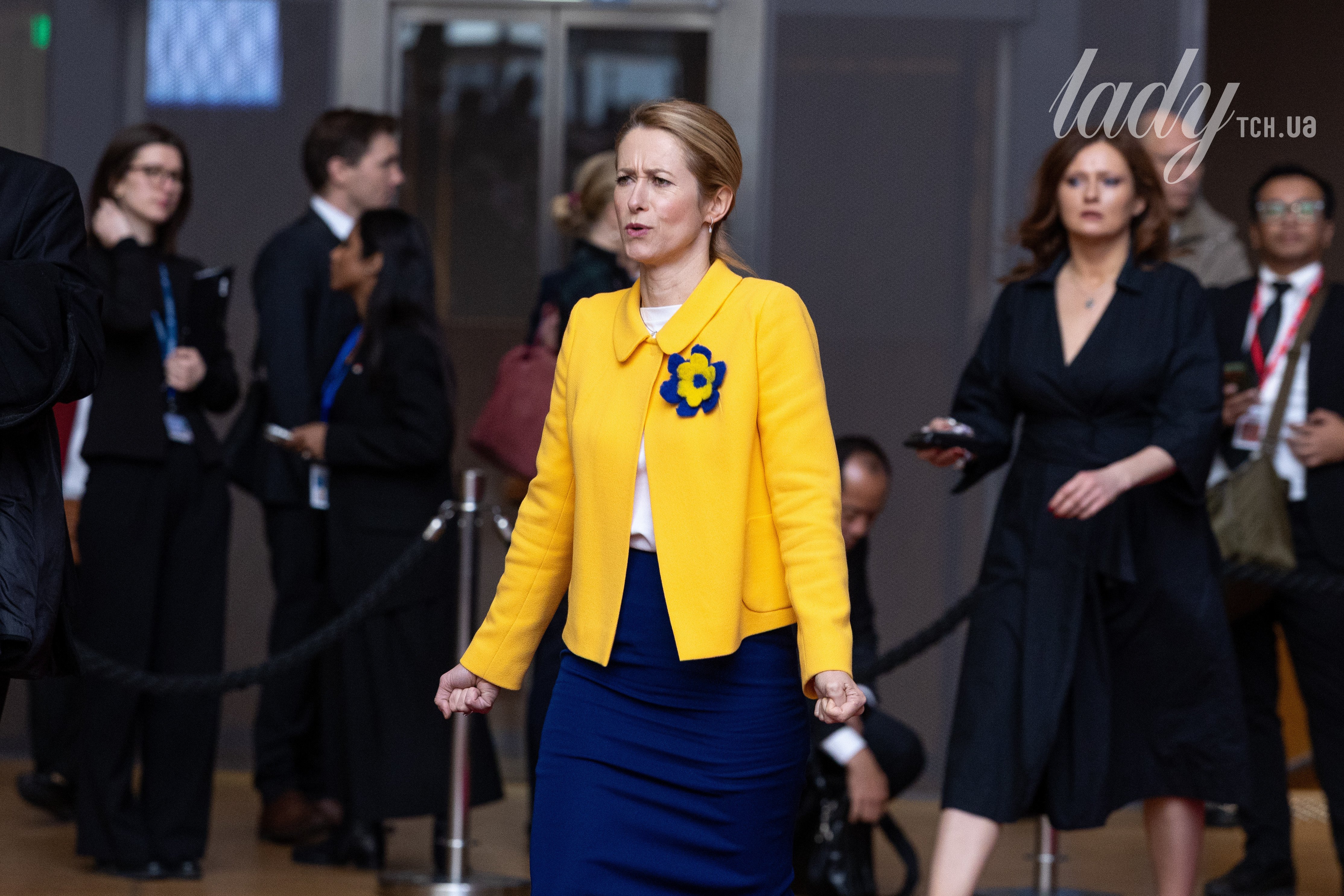Політикиня постала там у діловому образі у кольорах українського прапора. Вона була одягнена у жовтий жакет із круглим коміром, прихованим ґудзиком і накладними кишенями та темно-синю спідницю-олівець. Лук Кая доповнила білим топом.