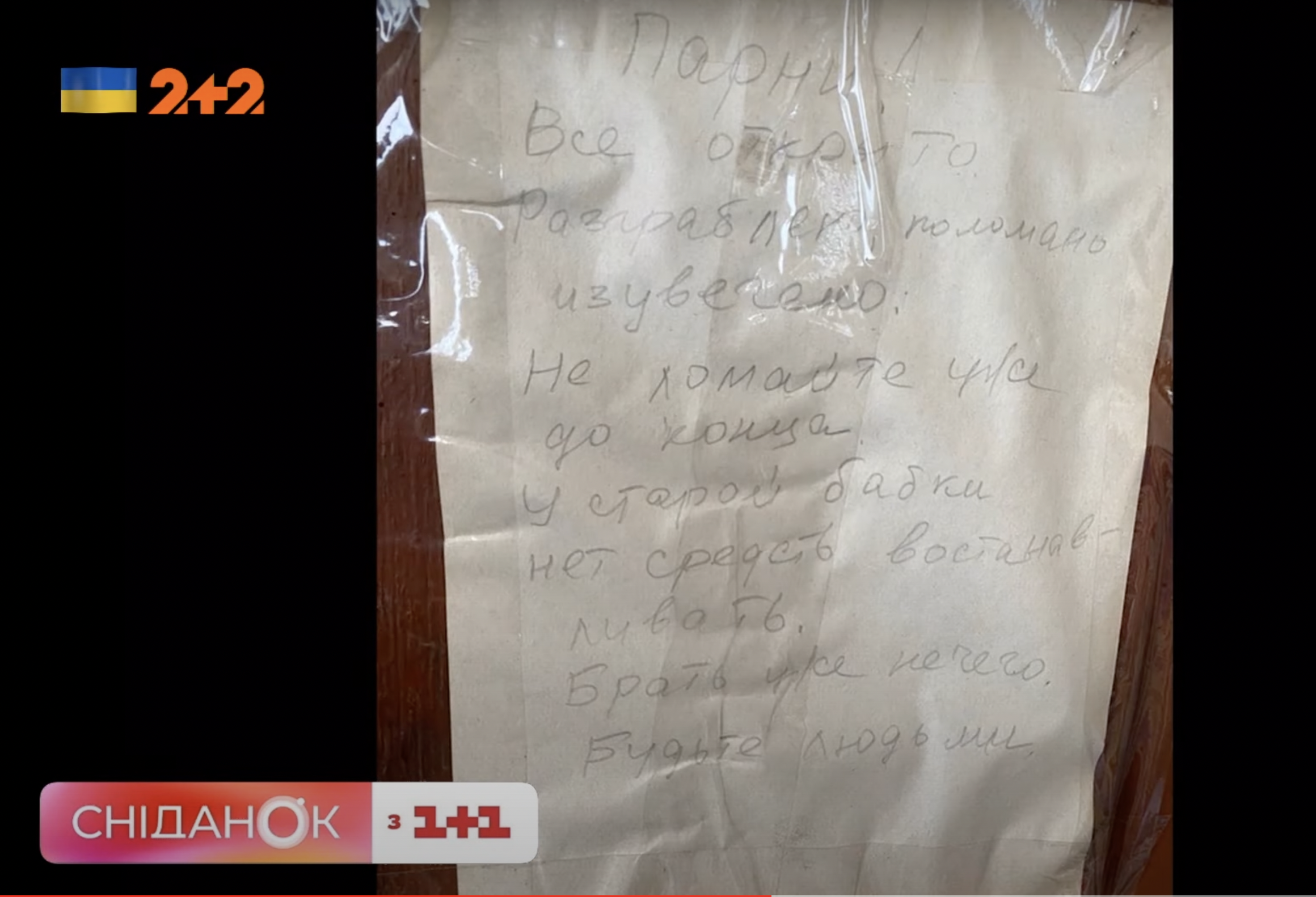 Наступного дня вирішила повторити маневр. Стало зрозуміло, що в будинку ночували окупанти. За ним вони організували вогневу точку, щоб стріляти у бік Мощуна. Окупанти облаштували собі добре захищений бліндаж. Жінка написала їм записку, в якій попросила не доламувати те, що ще вціліло.