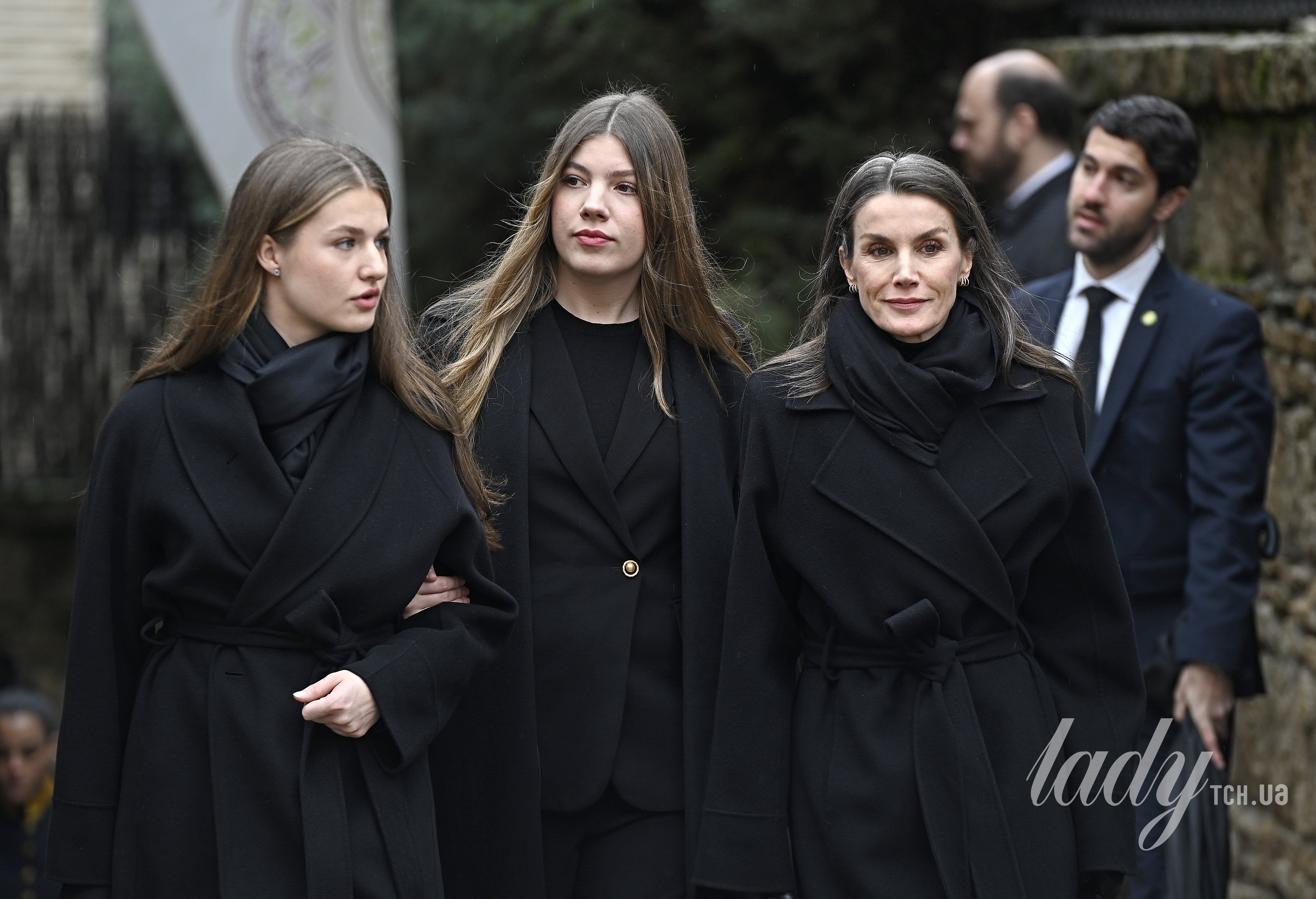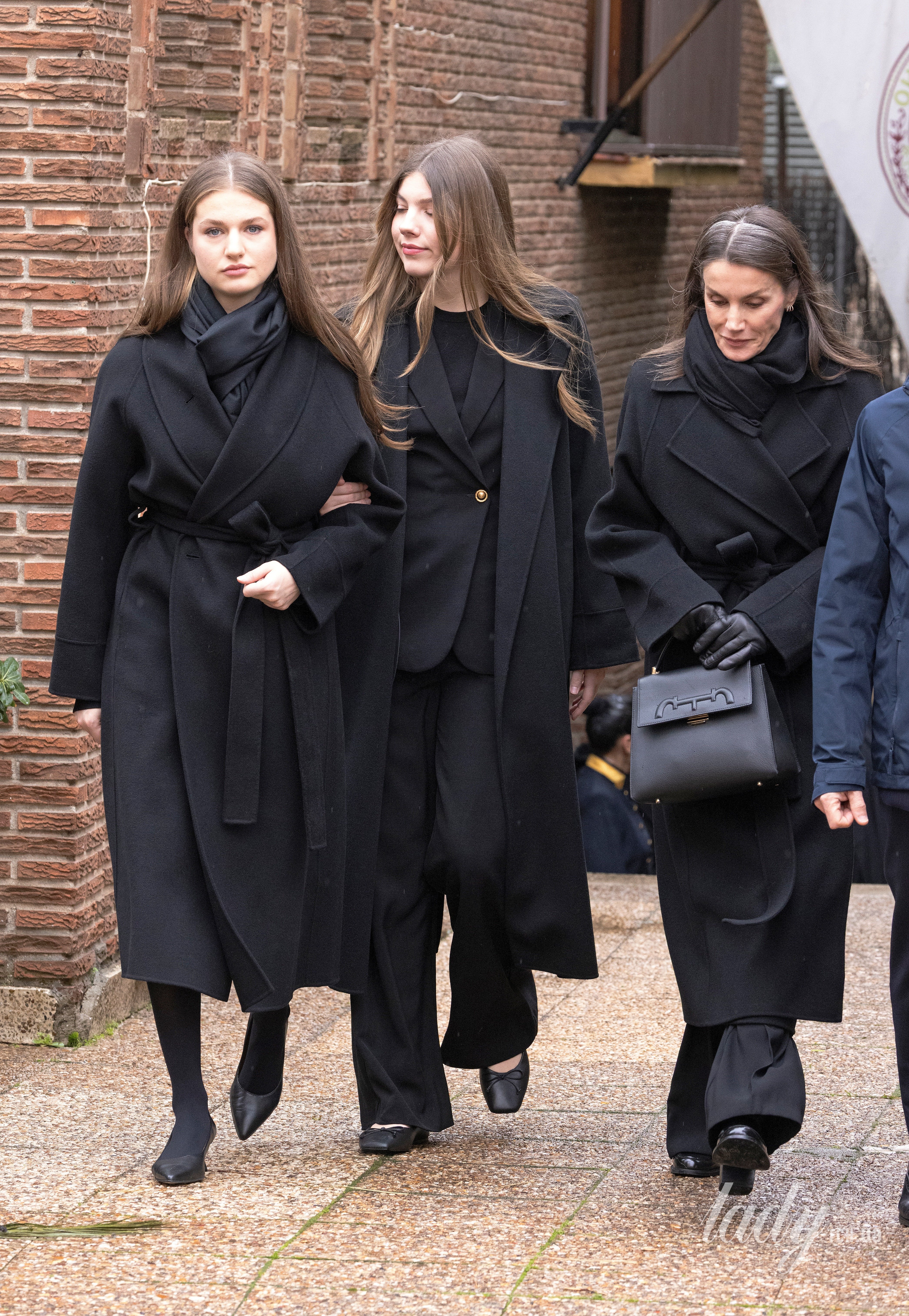 Королева Летиція та її дочки були одягнені в чорне вбрання. На короелві було довге пальто, широкі штани та шарф на шиї, а в руках улюблена сумка Carolina Herrera. Інфанта Софія одягла чорний штанний костюм і довге пальто, а взута була в туфлі, а її сестра принцеса Леонор була в схожому вбранні, як у її матері і туфлях-човниках на невисоких підборах.