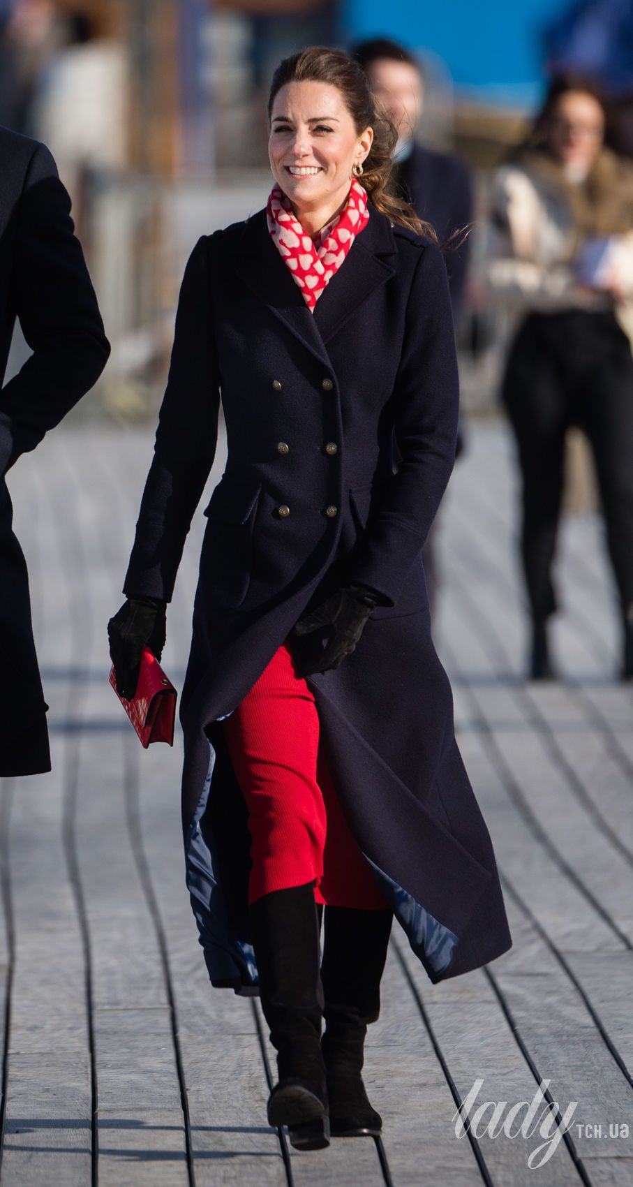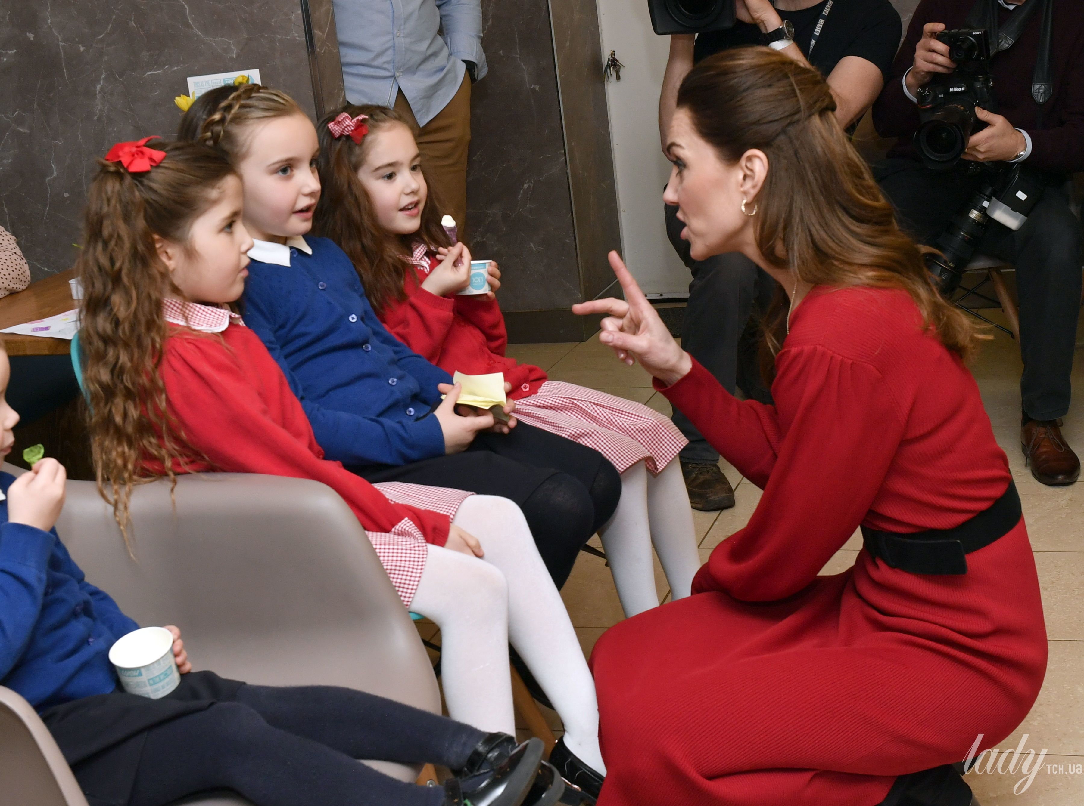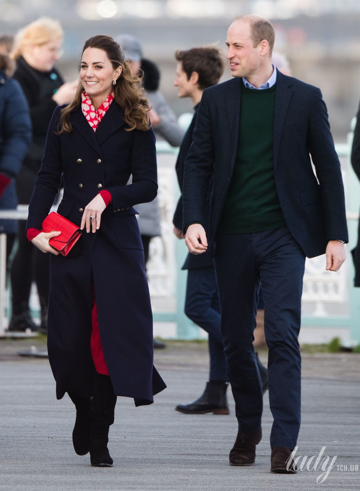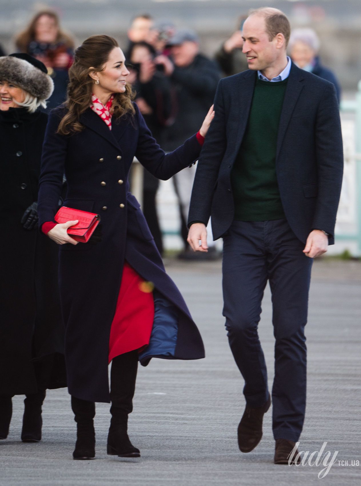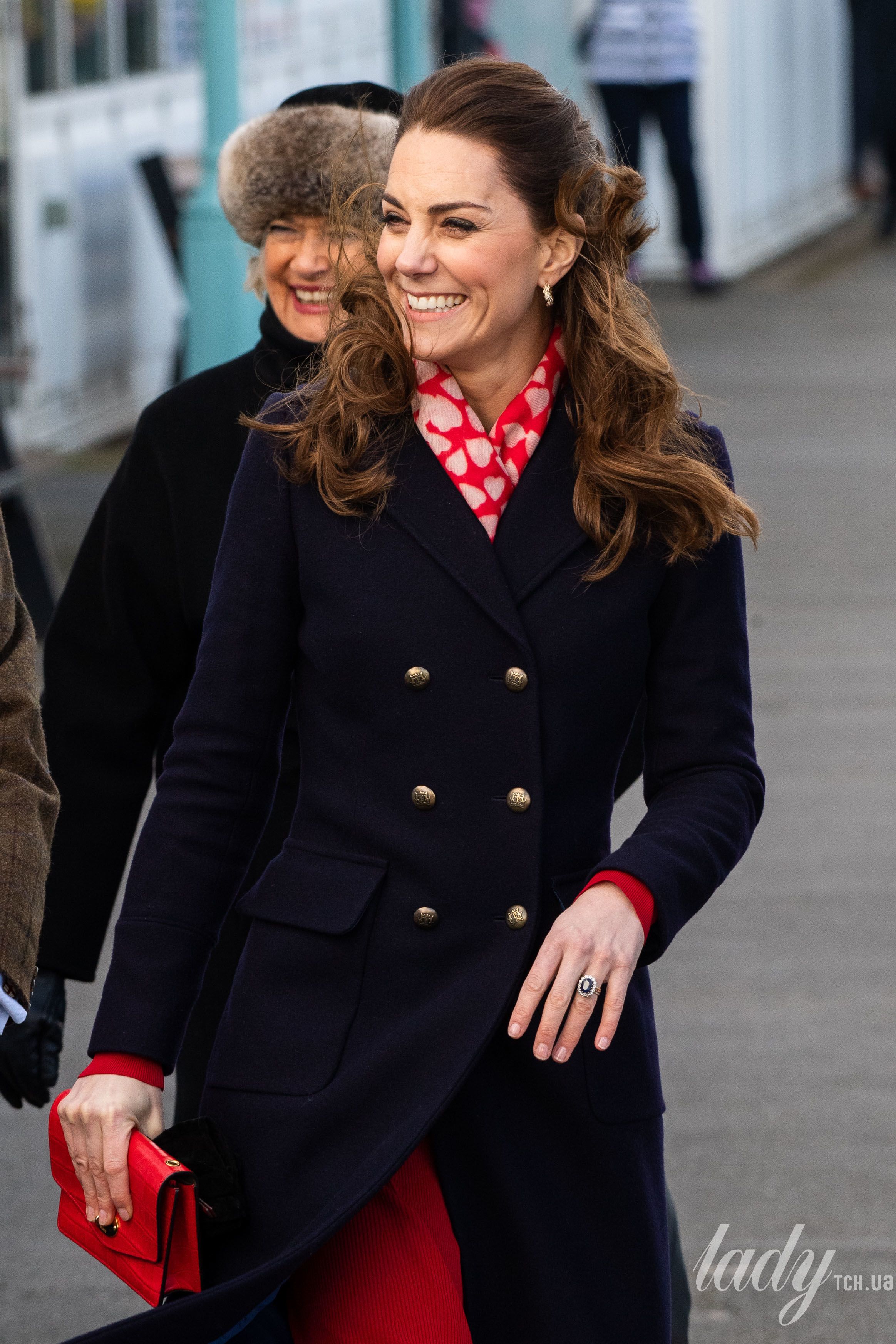 Під час цієї поїздки 38-річна герцогиня Кетрін продемонструвала стильний аутфіт в дешевій сукні від Zara і двобортному пальті від Hobbs, поєднуючи вбрання з червоним крокодилячим клатчем від Mulberry.