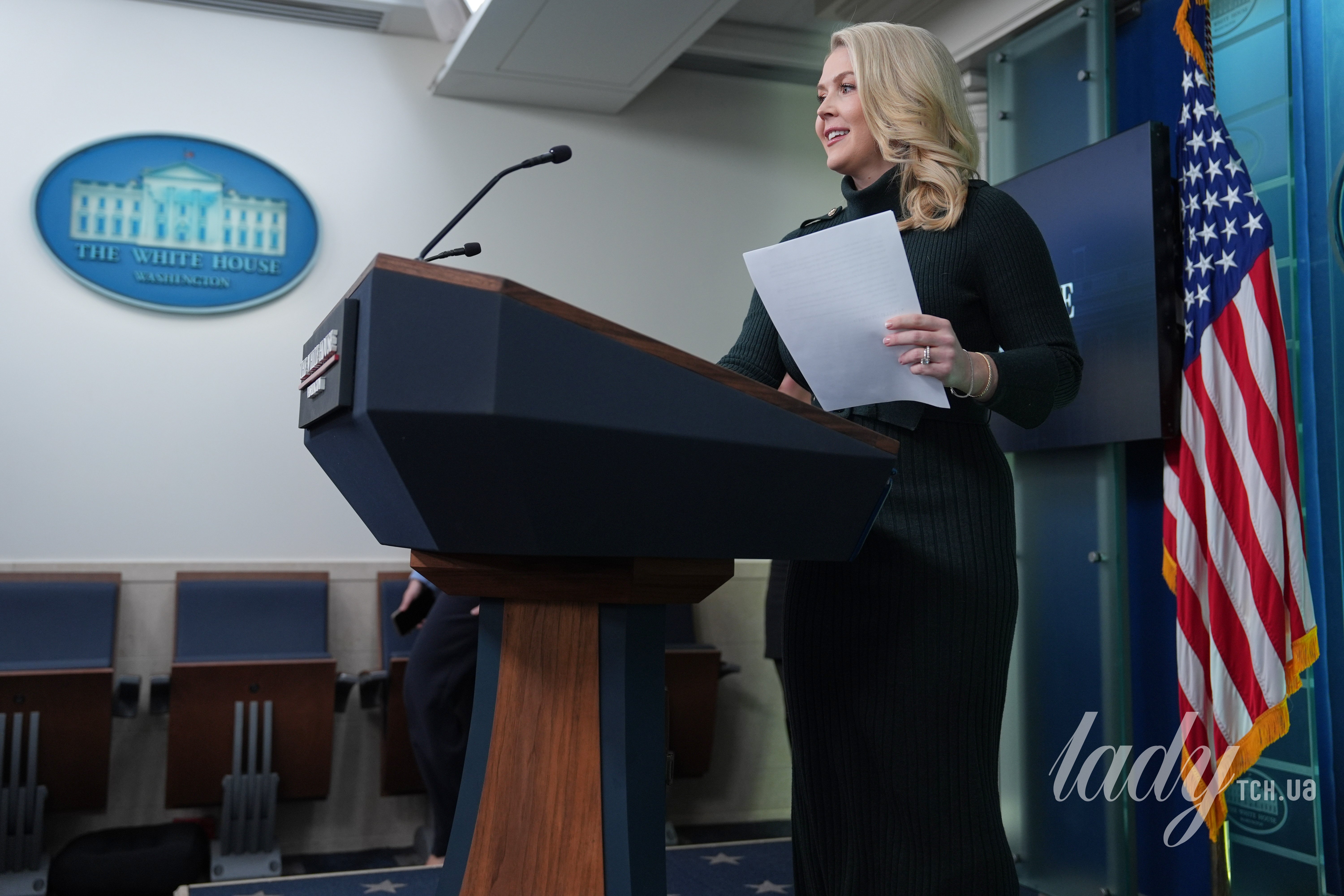Вагітна прессекретарка Трампа у трикотажній сукні з хлястиками з’явилася на брифінгу