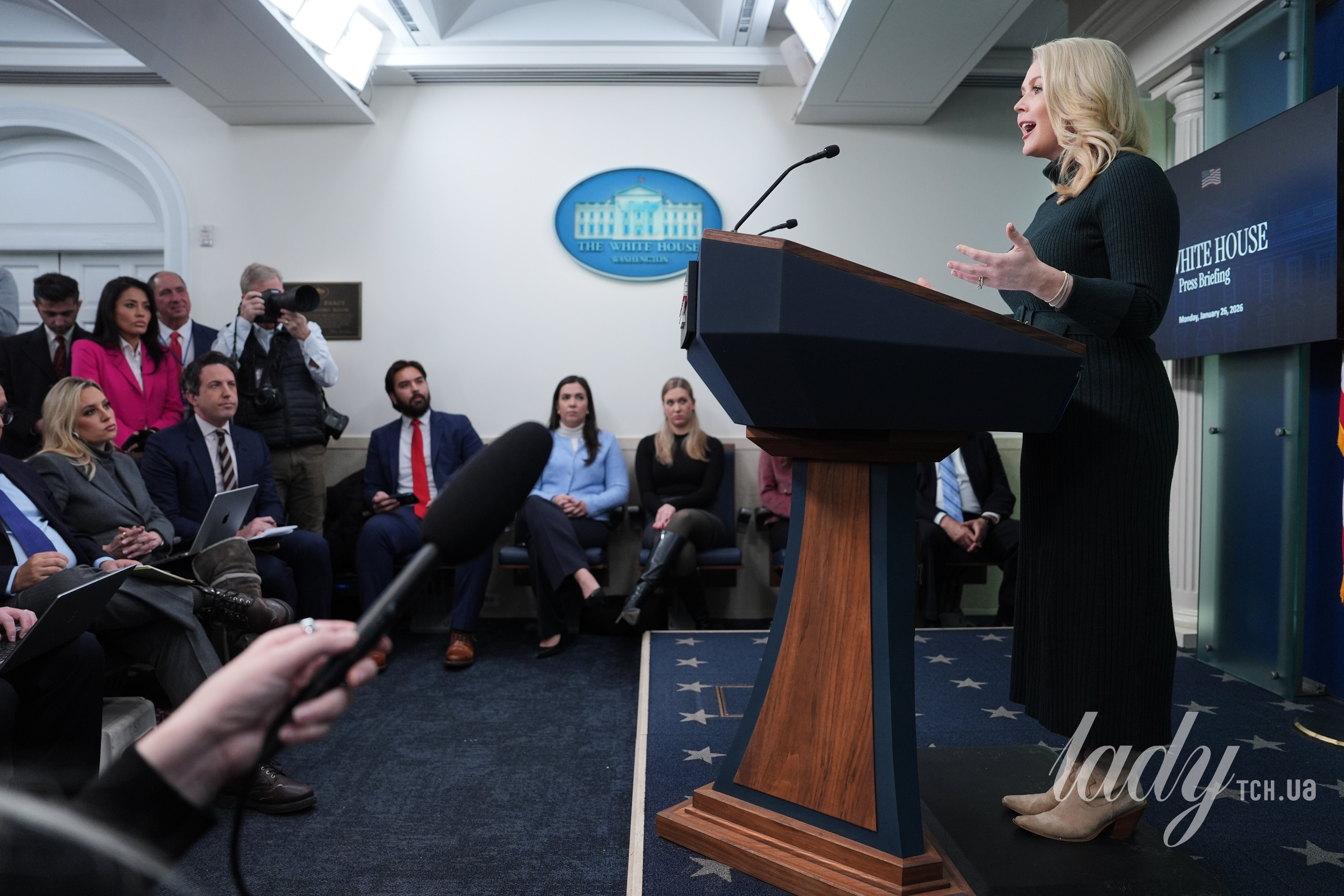 Вагітна прессекретарка Білого дому Керолайн Левітт поспілкувалася з журналістами у кімнаті для брифінгів преси імені Джеймса Брейді у Білому домі, у Вашингтоні.