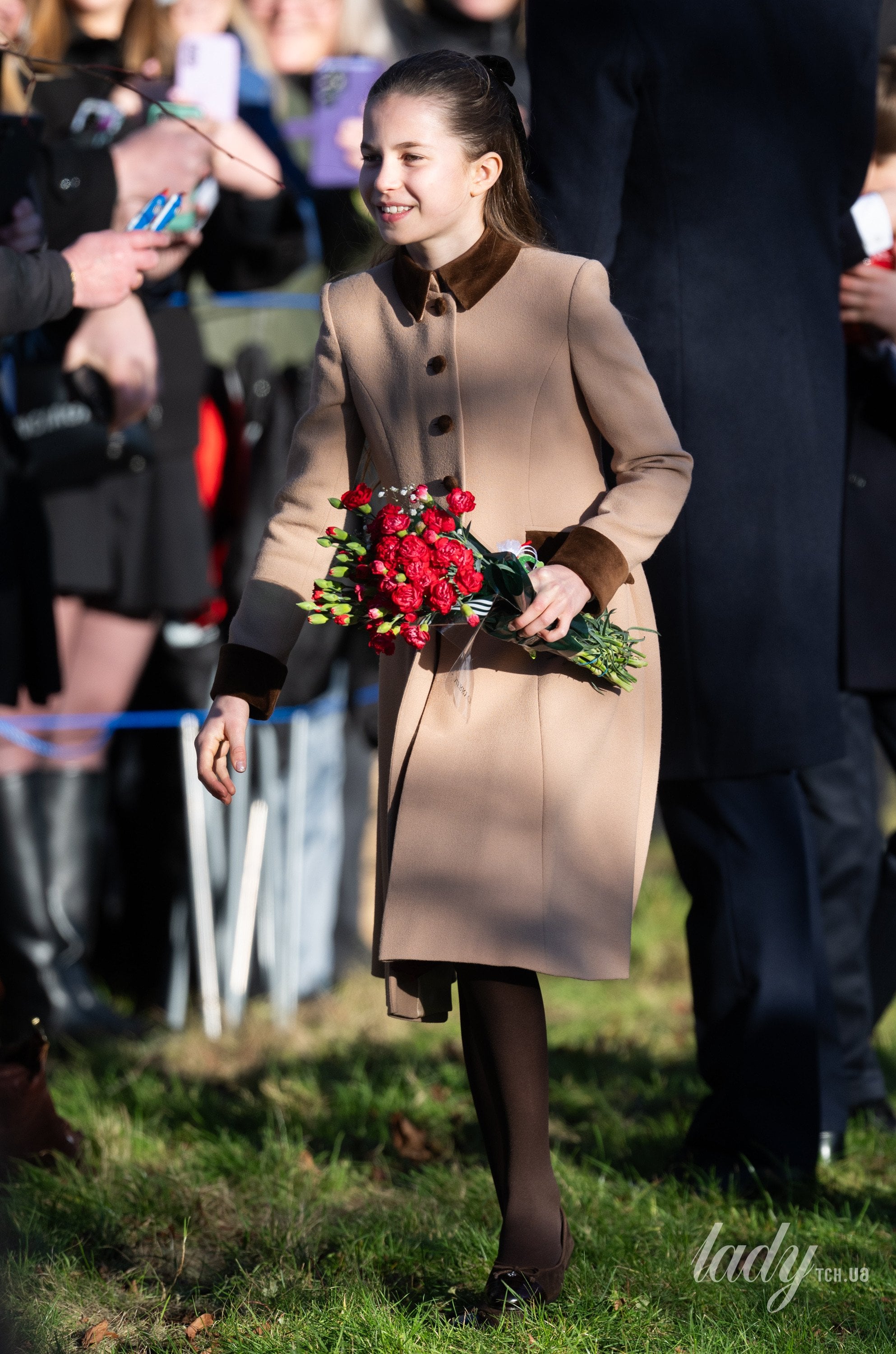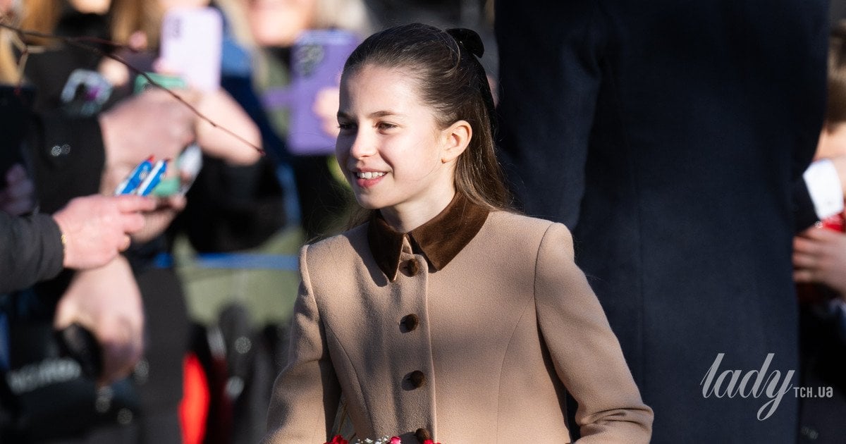 10-річна дочка Уельських мала стильний вигляд в бежевому пальті, зшитому на замовлення від Catherine Walker, була в щільних коричневих колготах і взута в замшеві балетки від Tory Burch. Волосся принцеси було зібрано ззаду в її улюблений бант.