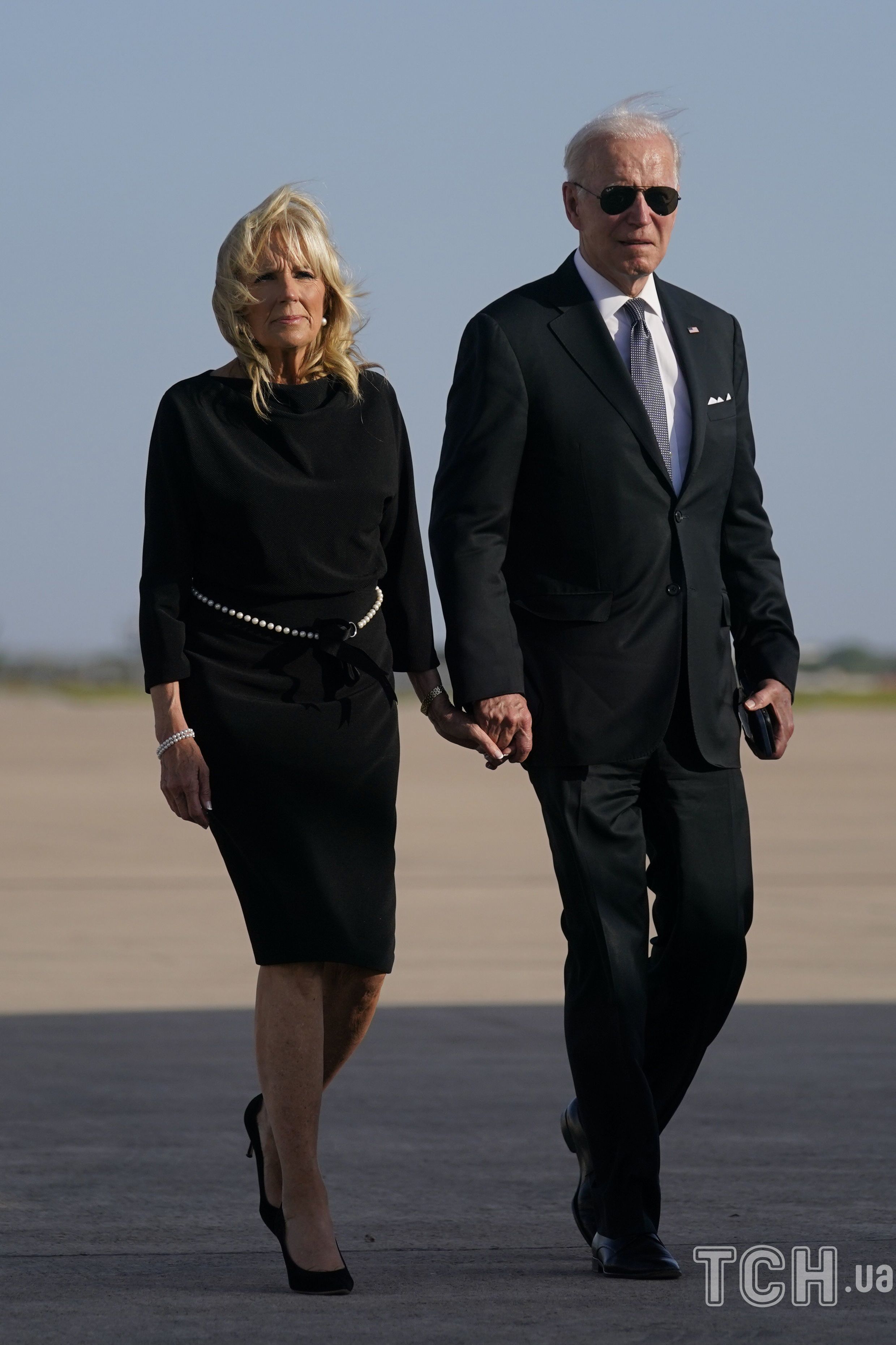Щоб вшанувати пам'ять загиблих та покласти квіти, до Техасу прилетіли президент США Джо Байден та перша леді Джилл Байден. Перша леді одягла чорну сукню та замшеві туфлі-човники. Вбрання дружина президента США прикрасила поясом з намистинами, а також одягла перлинні сережки та браслет.