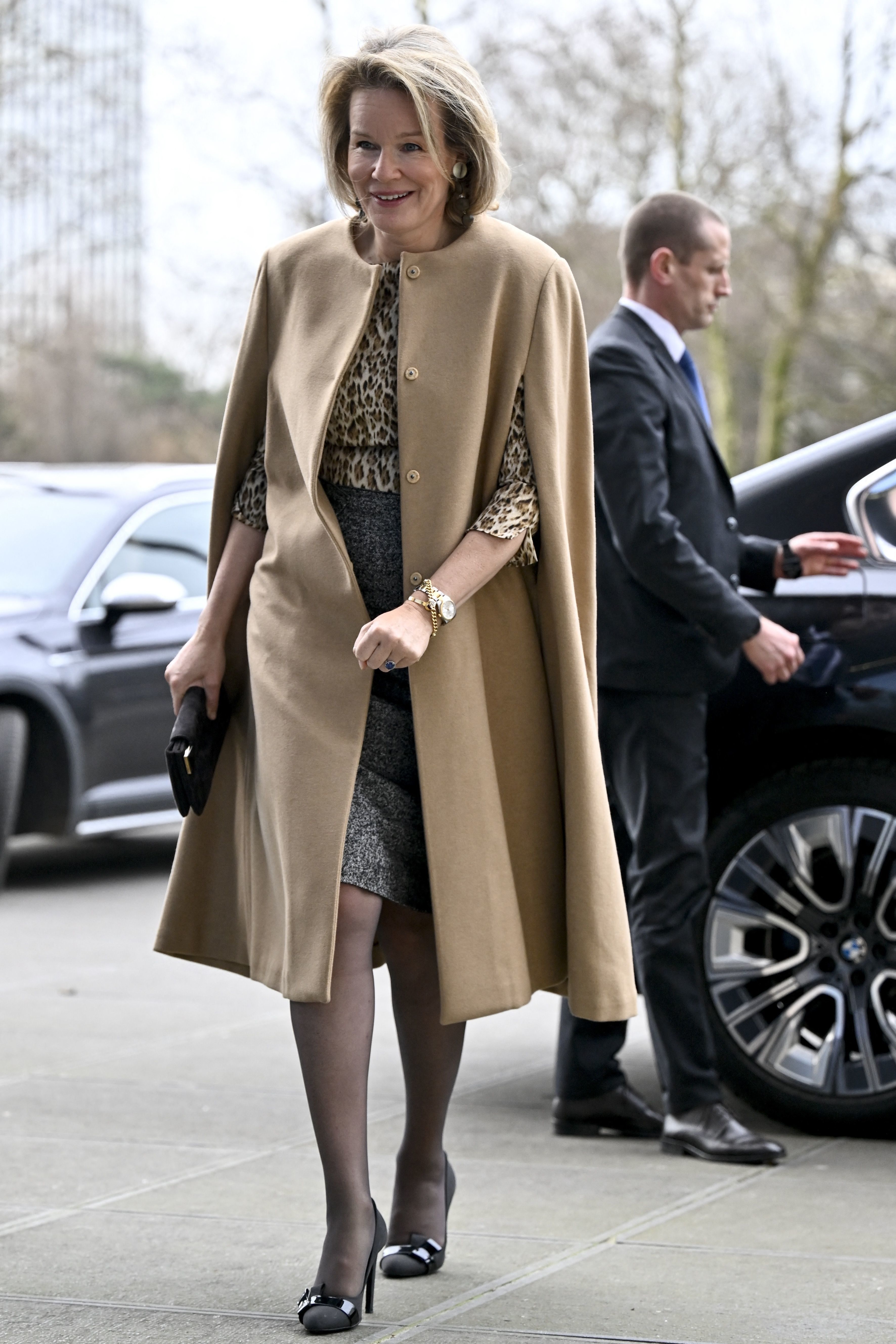 Вона з’явилася на заході у насиченому синьому штанному костюмі та кейппальті синього кольору, доповнивши образ туфлями-човниками із замші та мініатюрним клатчем, а образ нагадував деякі виходи королеви Максими. Схоже, що новий стиліст бельгійської королеви надихався стилем Максими Нідерландської.