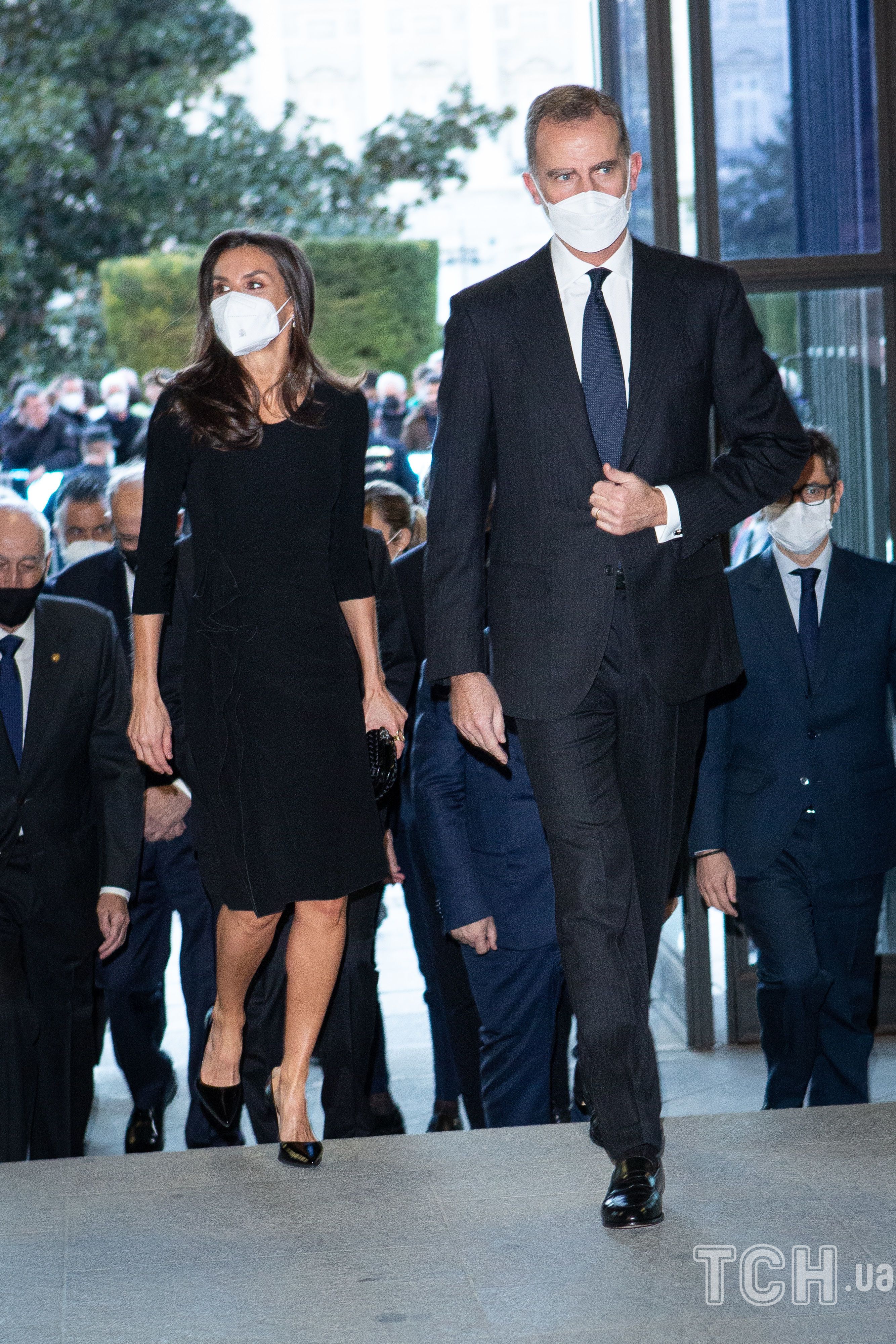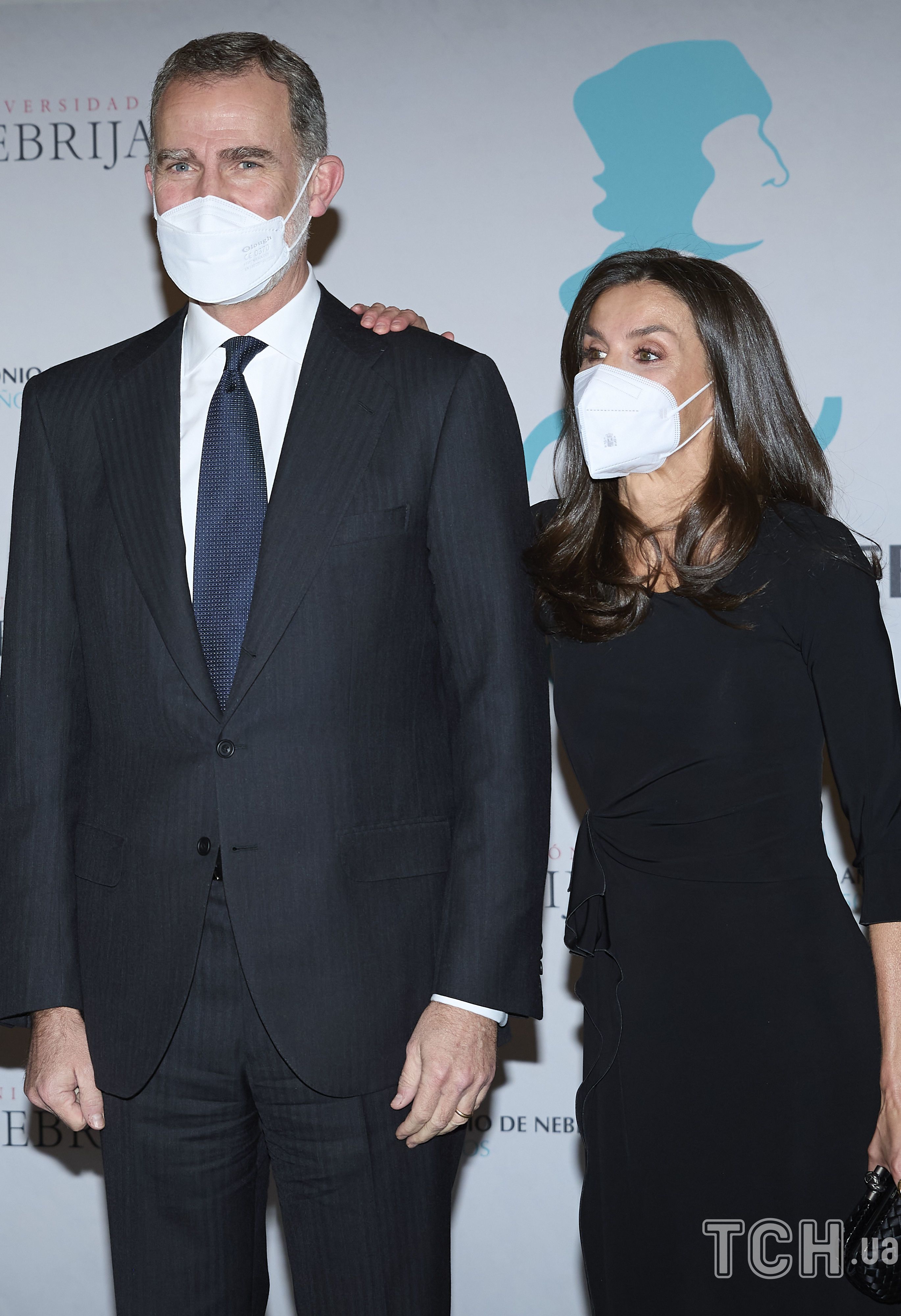 Волосся Летиції було розпущене, на обличчі був макіяж і захисна маска, а у вухах виблискували дорогоцінні сережки. Король Філіп був теж у темному костюмі, білій сорочці та темно-синій краватці. І обов'язково у захисній масці на обличчі.