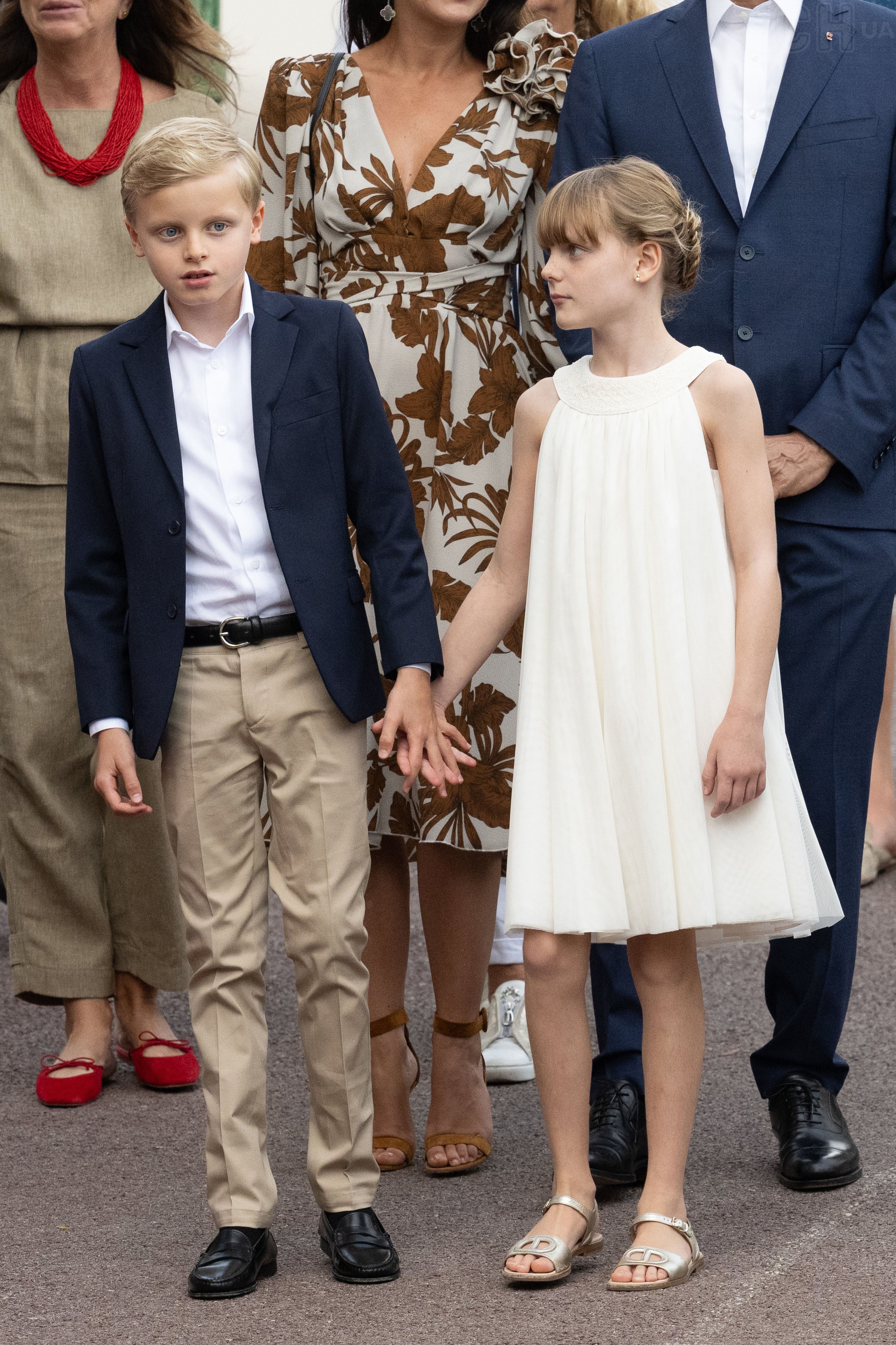 9-річний принц Жак був одягнений у синій піджак, білу сорочку та пісочні штани у поєднанні з чорними шкіряними туфлями та чорним шкіряним ременем на поясі. Маленький принц тримав свою 9-річну сестру принцесу Габріеллу за руку, що мало такий зворушливий вигляд.