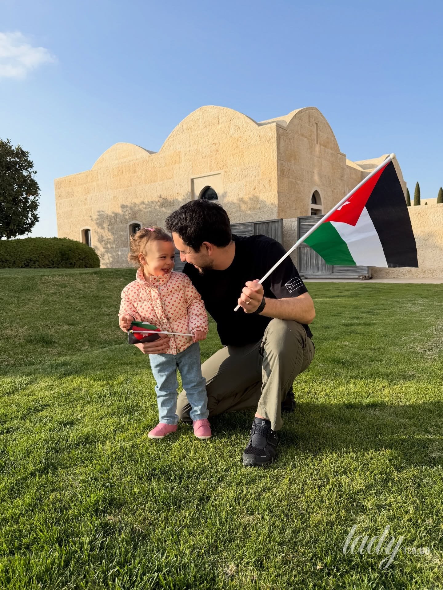 Старший син королеви Ранії та короля Абдалли II — кронпринц Хусейн показав, як вони зі своєю півторарічною дочкою принцесою Іман відсвяткували День прапора.