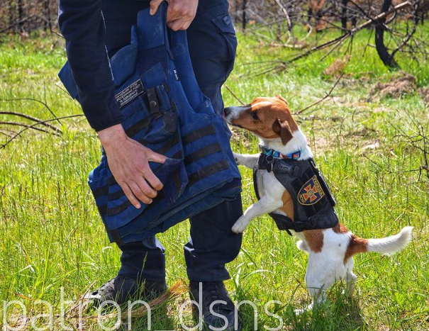 На знімках собак-розмінувальник постав у службовій жилетці з шевроном.