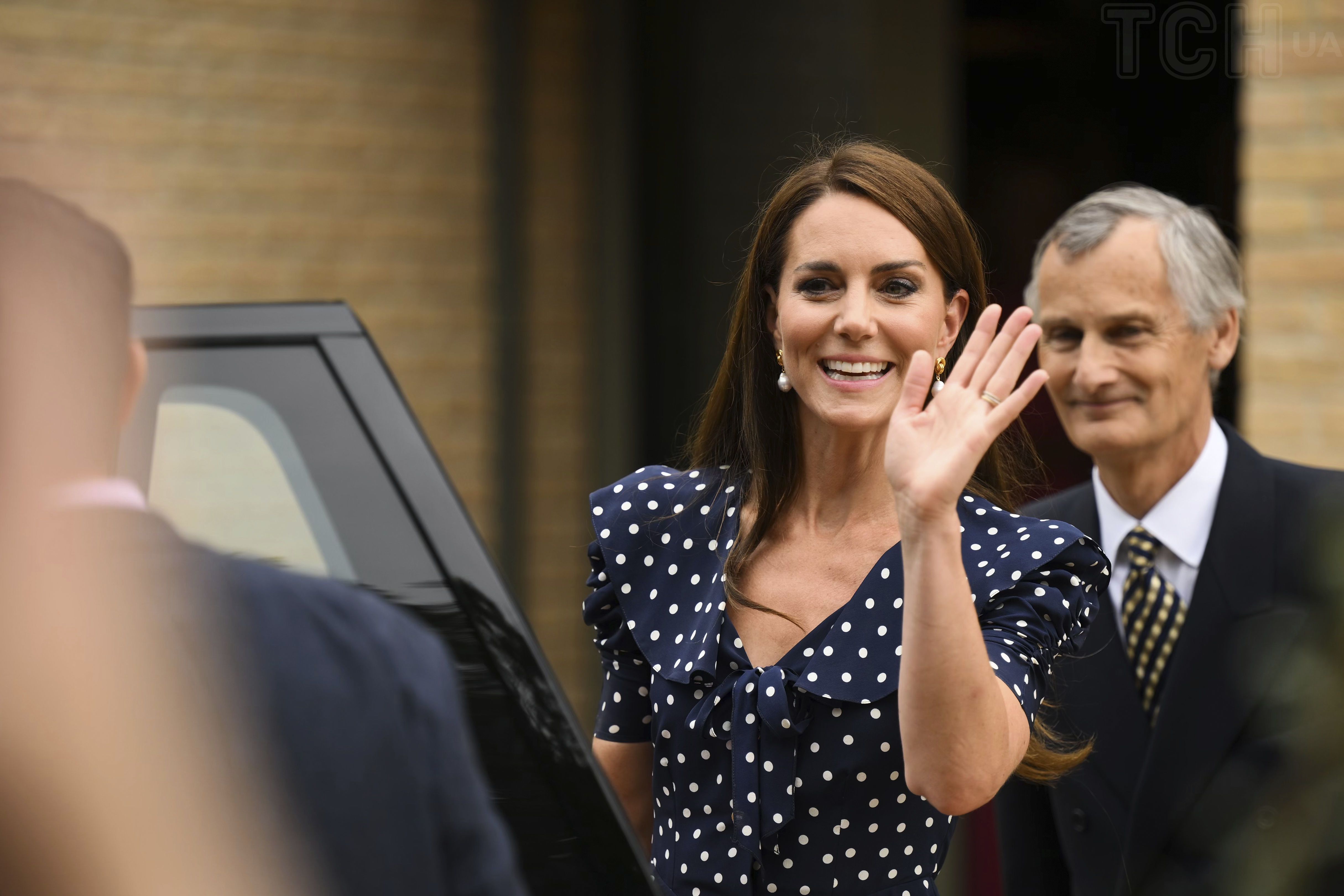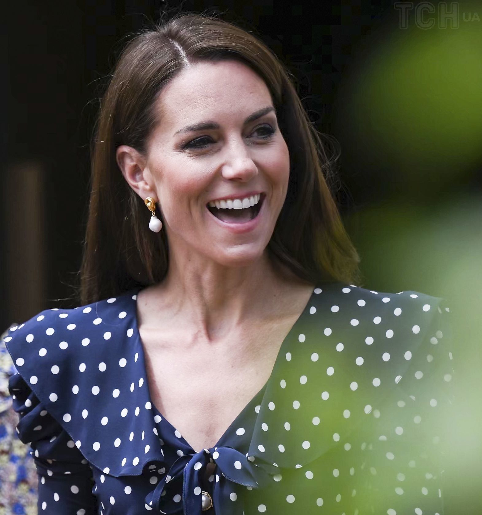 Принцеса Уельська одягла темно-синю шовкову сукню з принтом у горох від Alessandra Rich з бантом на грудях і перлинними ґудзиками, взула туфлі з ремінцями та білим носком теж від Alessandra Rich, в руках тримала маленьку білу сумку від Mulberry, а з прикрас одягла золоті сережки із перлинною підвіскою від shyla.london. У Кетрін було розпущене і красиво укладене волосся, а на обличчі легкий денний макіяж.