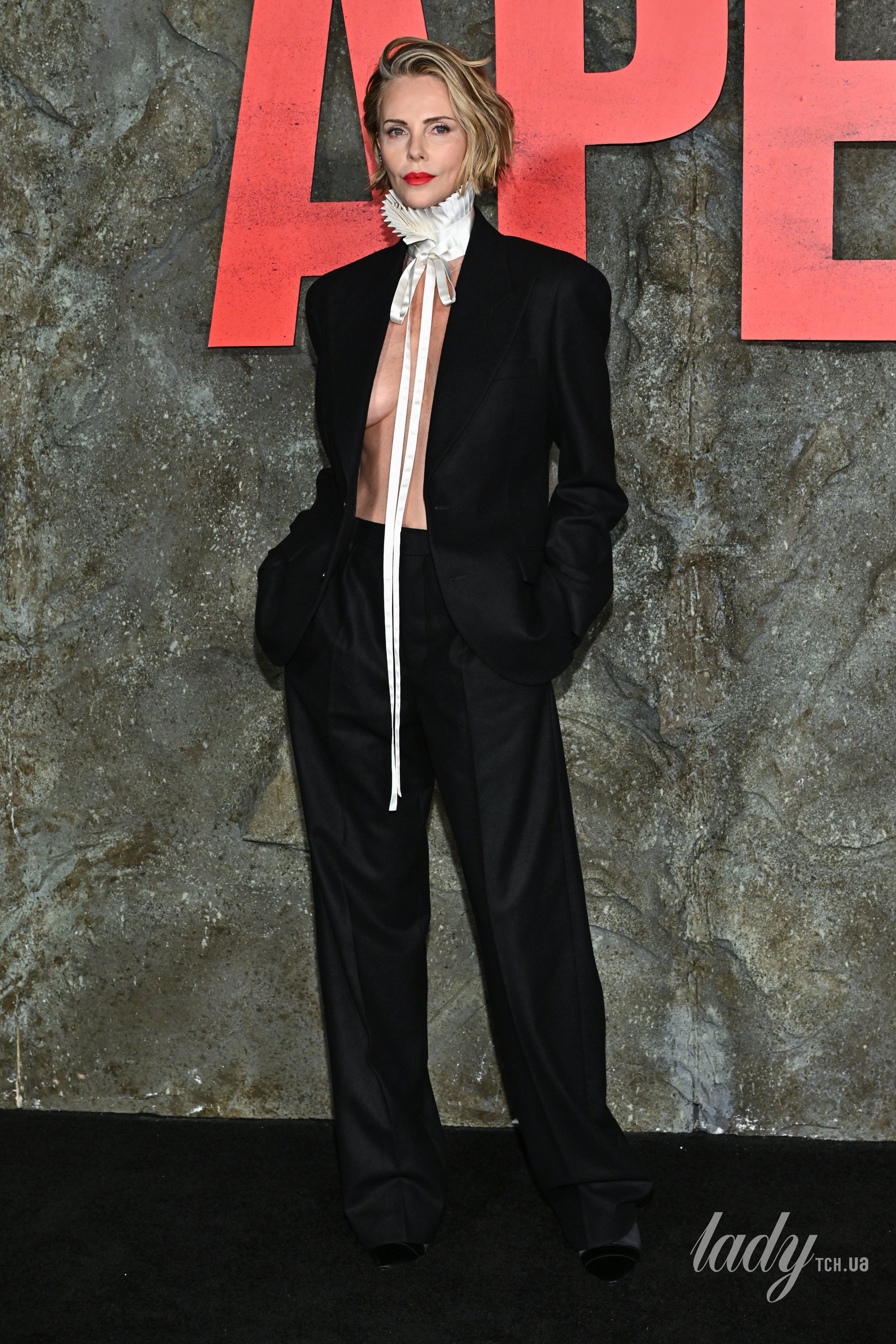 Маскулінний образ Терон був представлений під час демонстрації чоловічої колекції одягу на сезон осінь-зима 2026. Лук складався з оверсайз жакету і прямих класичних штанів. Пікантності луку додало те, що акторка вирішила одягнути жакет на голе тіло, а замість прикраси на шию обрала білий шовковий комір зі складками і зав’язками.
