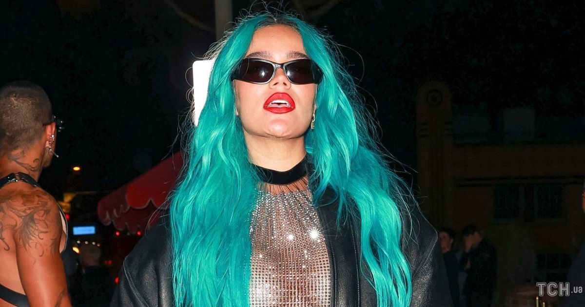 Для паті красуня обрала провокаційний аутфіт. На ній була коротка сукня-сітка, розшита стразами. Під нею були чорні стринги і відсутній бюстгальтер, тому Karol G виблискувала своїм пишним бюстом, який прикривала довгим бірюзовим волоссям.