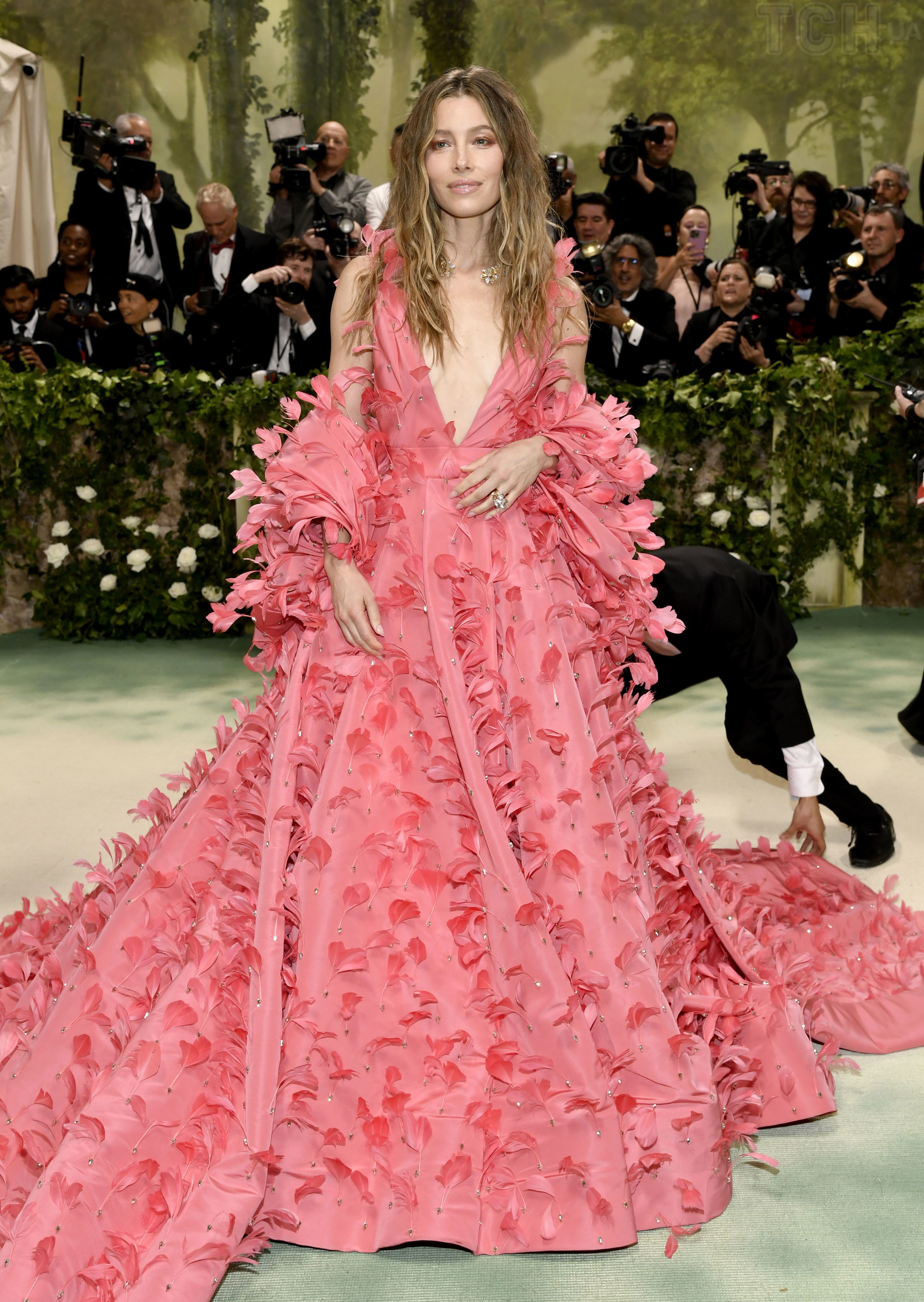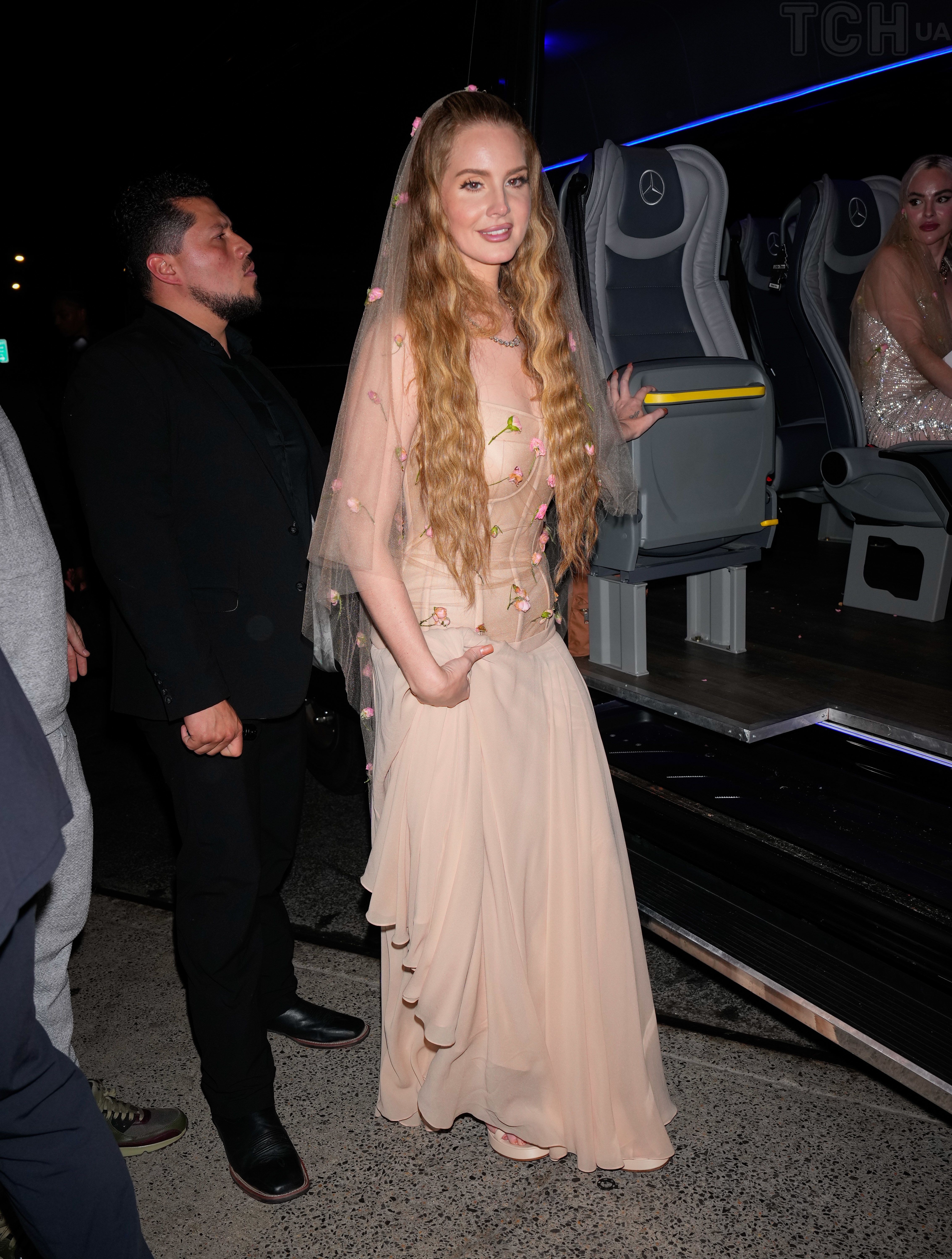 На співачці була довга ніжно-пудрова сукня, корсет якої прикрашали троянди. На голові акторка мала фату. Папараці сфотографували її після вечірки, коли вона йшла до машини.