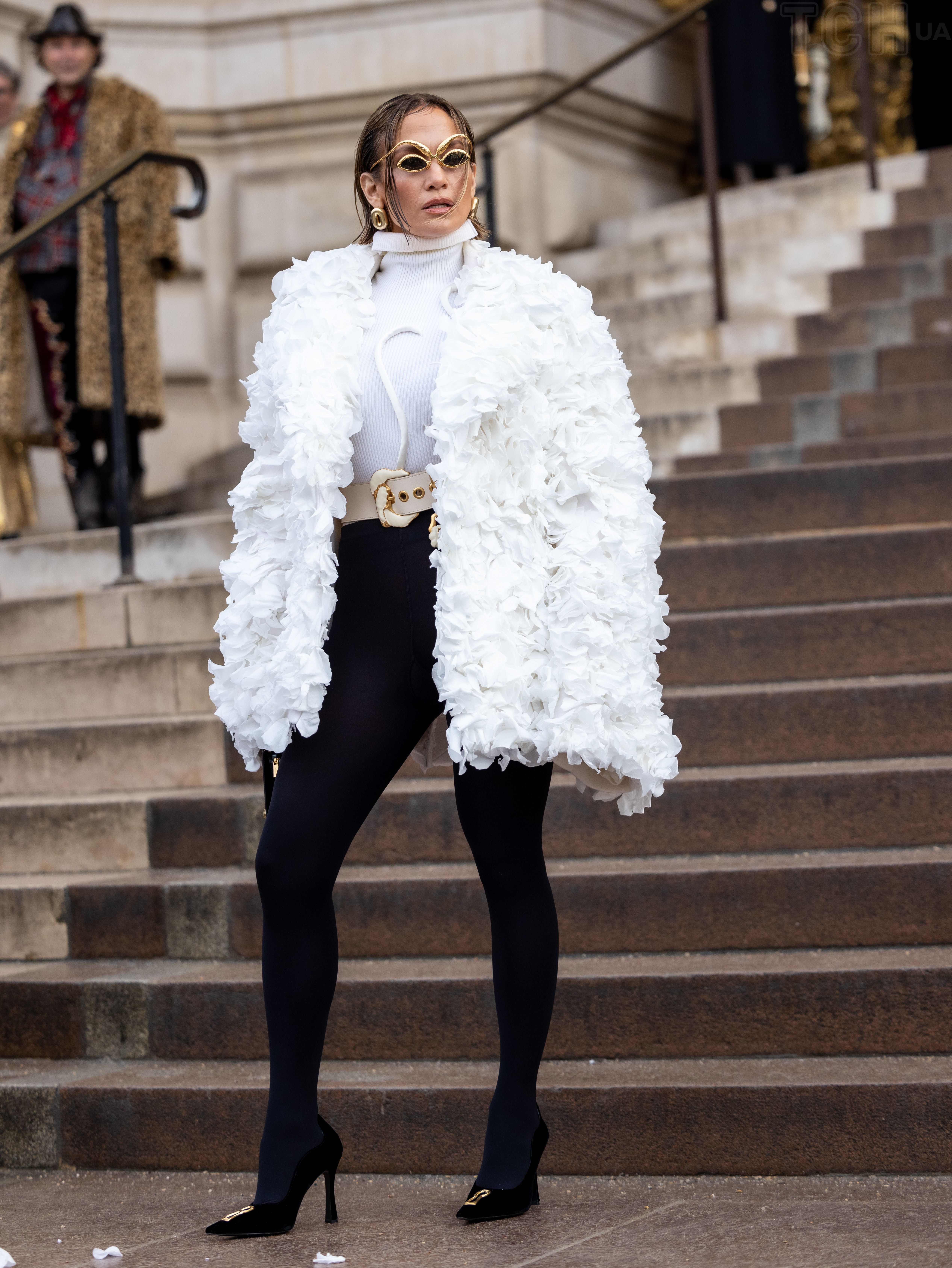 Дженніфер з'явилася на показі у трикотажній водолазці з аплікацією, яку вона поєднала із щільними чорними лосинами. Талію зірки прикрашав широкий ремінь із пряжкою.