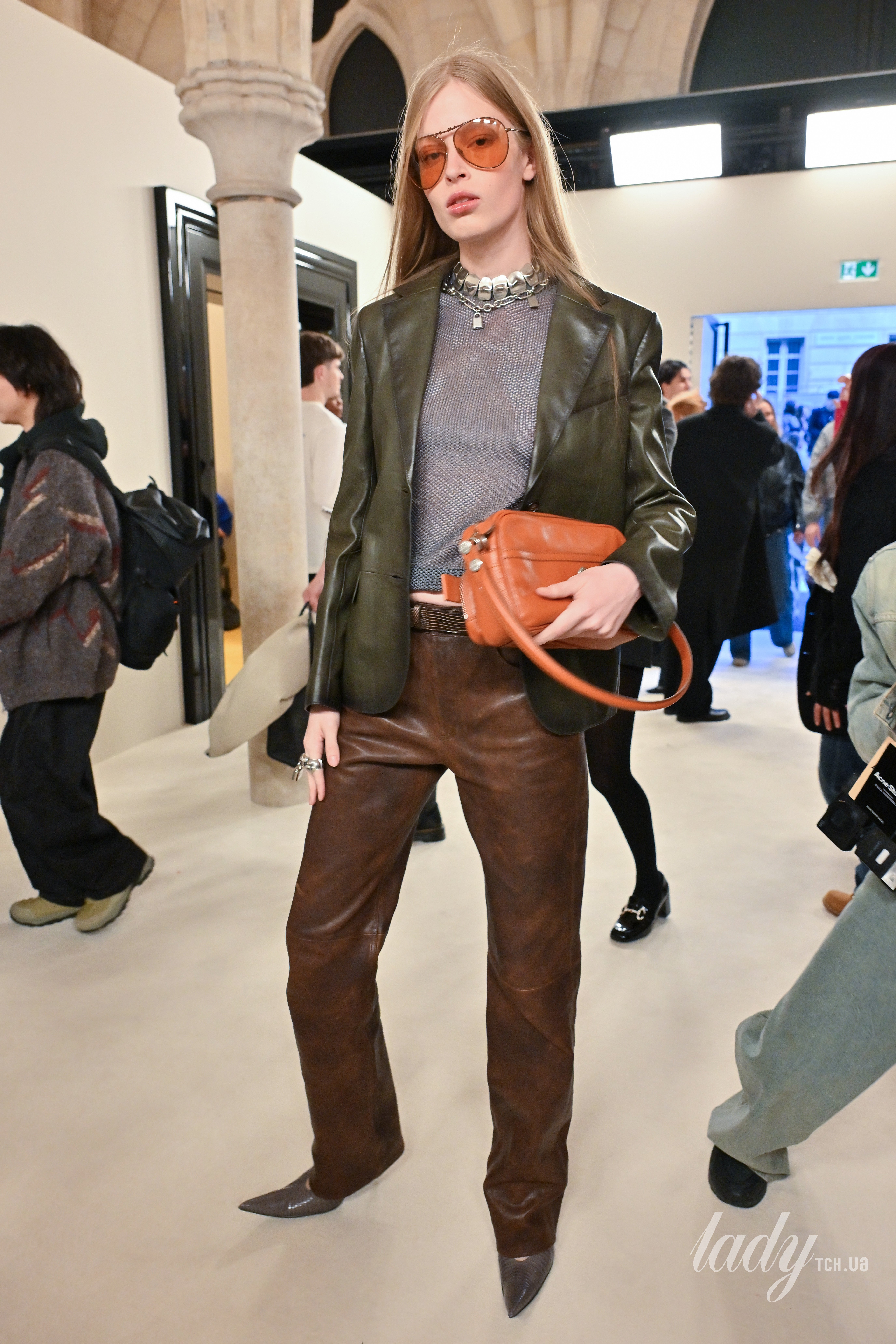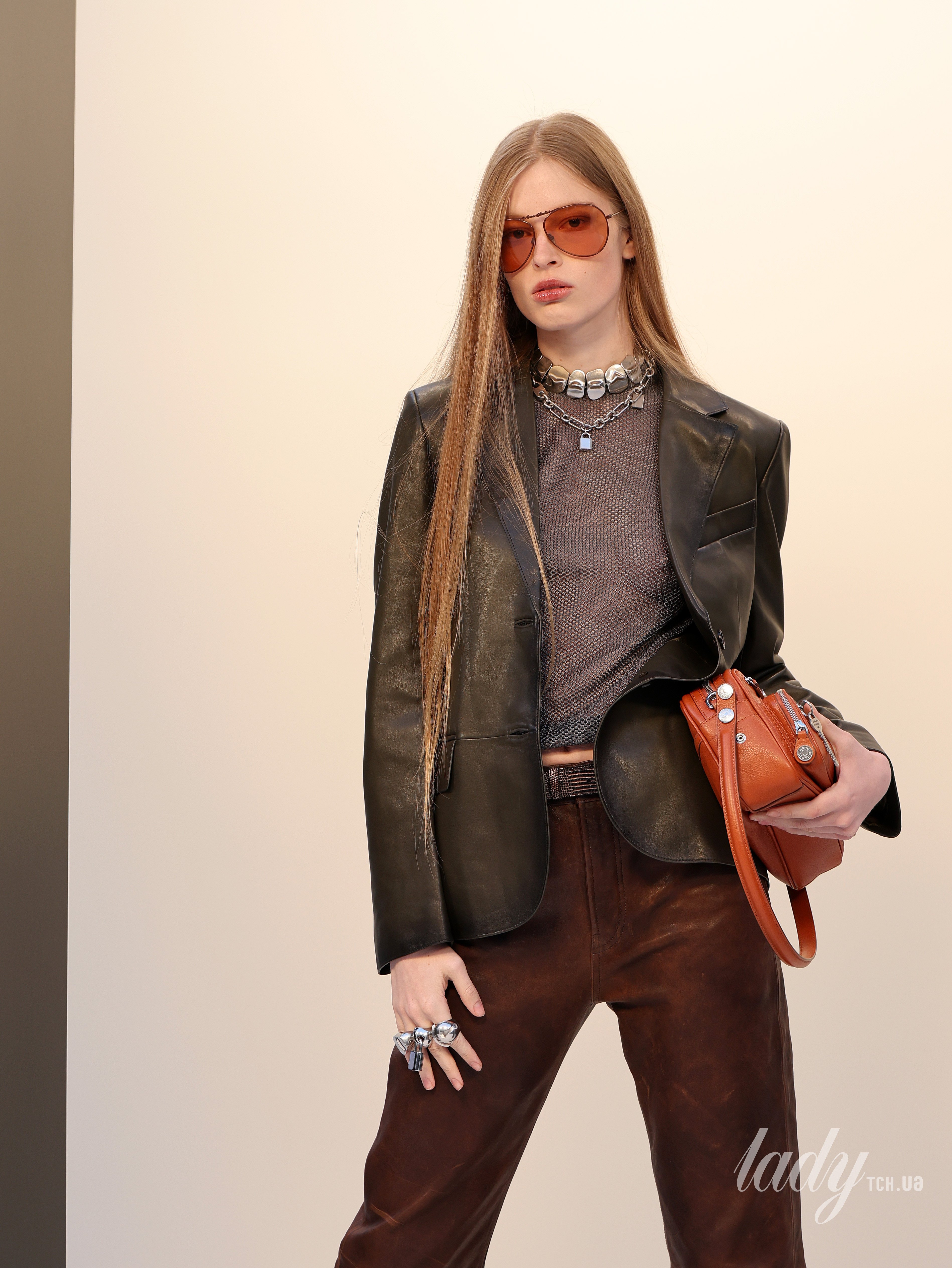 Також модель надягла на шию масивні кольє, а ось інші аксесуари до образу підібрала теракотового відтінку, зокрема окуляри-авіатори та шкіряну сумку з кишенями та довгим ремінцем.