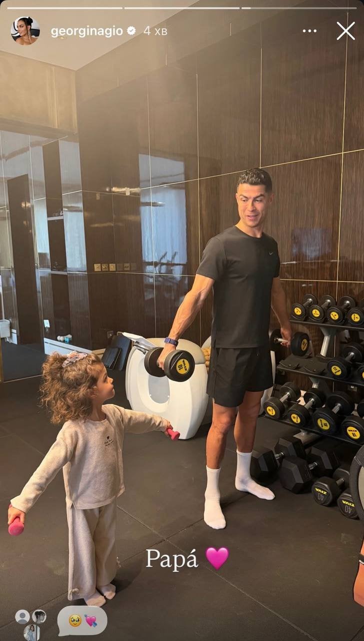 32-річна модель, інфлуенсер і наречена футболіста Кріштіану Роналду — Джорджина Родрігес, якій він нещодавно освідчився після 9 років стосунків і підніс каблучку з величезним діамантом, поділилася в Instagram фото, на якому зображено її нареченого та їхню молодшу доньку Беллу Есмеральду. Тато з донькою займаються в спортзалі.