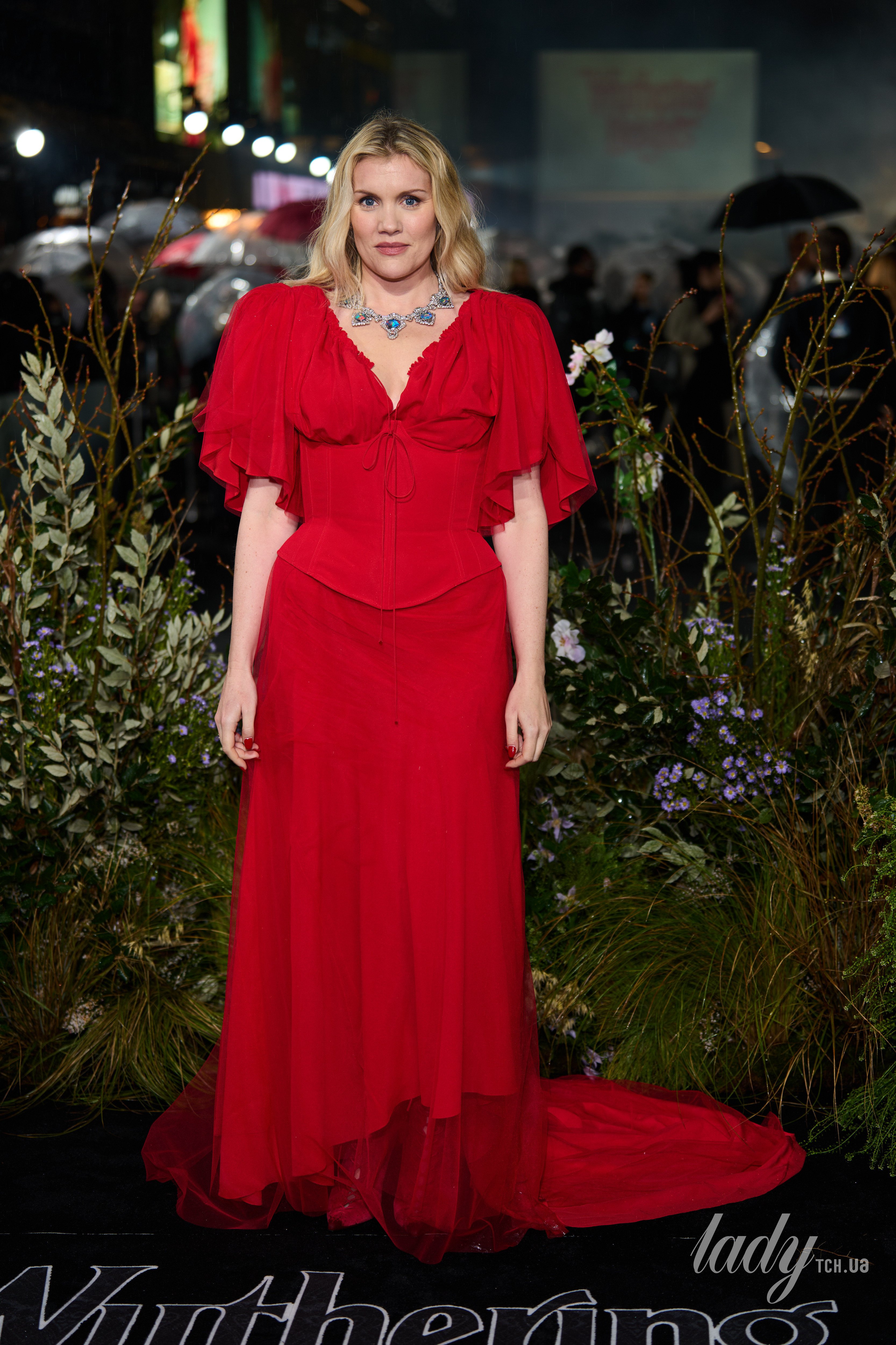 Еміралд Фіннелл, яка є режисеркою нової екранізації роману «Буремний перевал» з’явилася на прем’єрі у Лондоні. Вона обрала для появи яскраво-червону сукню з виразними архітектурними плечима від Vivienne Westwood.
