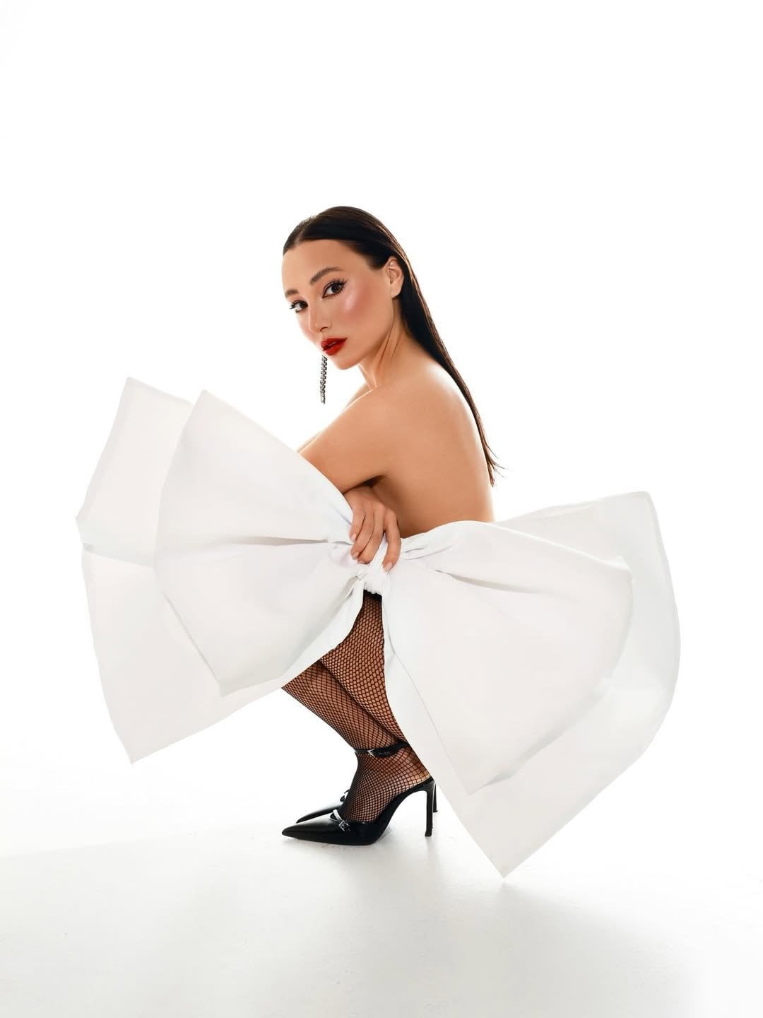 Дівчина позувала перед об’єктивом фотокамери без бюстгальтера. Груди вона прикрила великим білим бантом. На ній також були чорні колготи в сітку і чорні гостроносі босоніжки на шпильках.