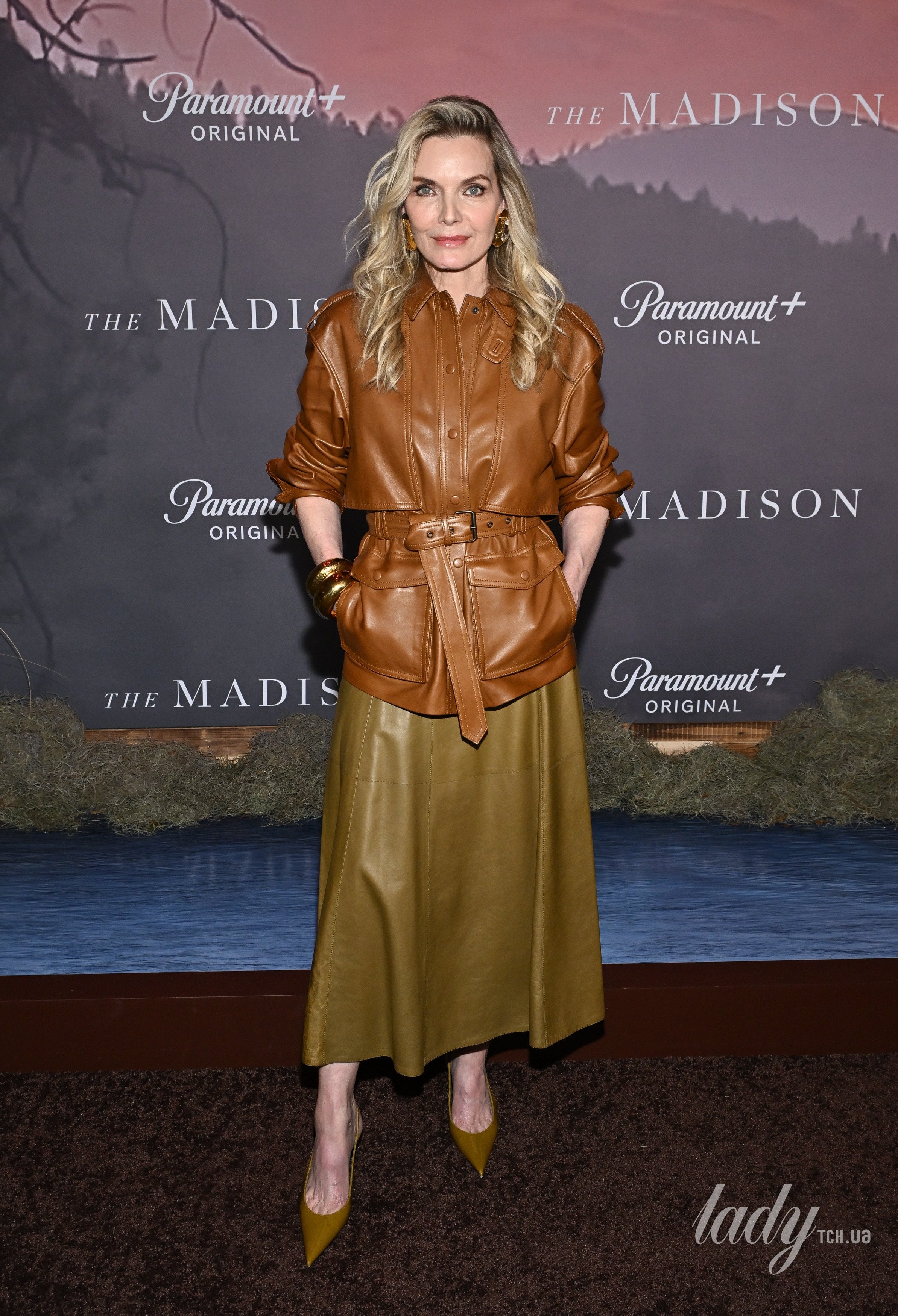 Мішель Пфайффер зіграла у новому проєкті — серіалі «Мадісон» і відвідала його презентацію у Нью-Йорку. Акторка одягла цікавий ансамбль зі шкіри, який був підібраний у золотисто-коричневій гамі.
