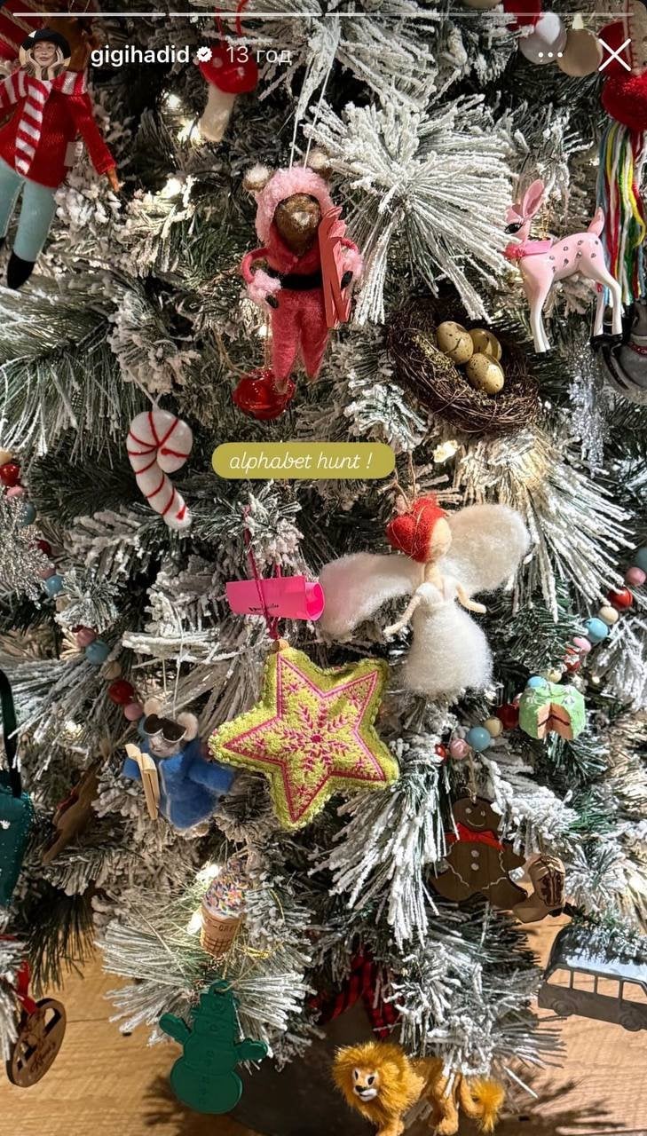 30-річна американська топмодель Джіджі Хадід продемонструвала штучну ялинку, вкриту «снігом» і прикрашену різноманітними іграшками — від дерев’яних і скляних до виготовлених з фетру і валяних з вовни.