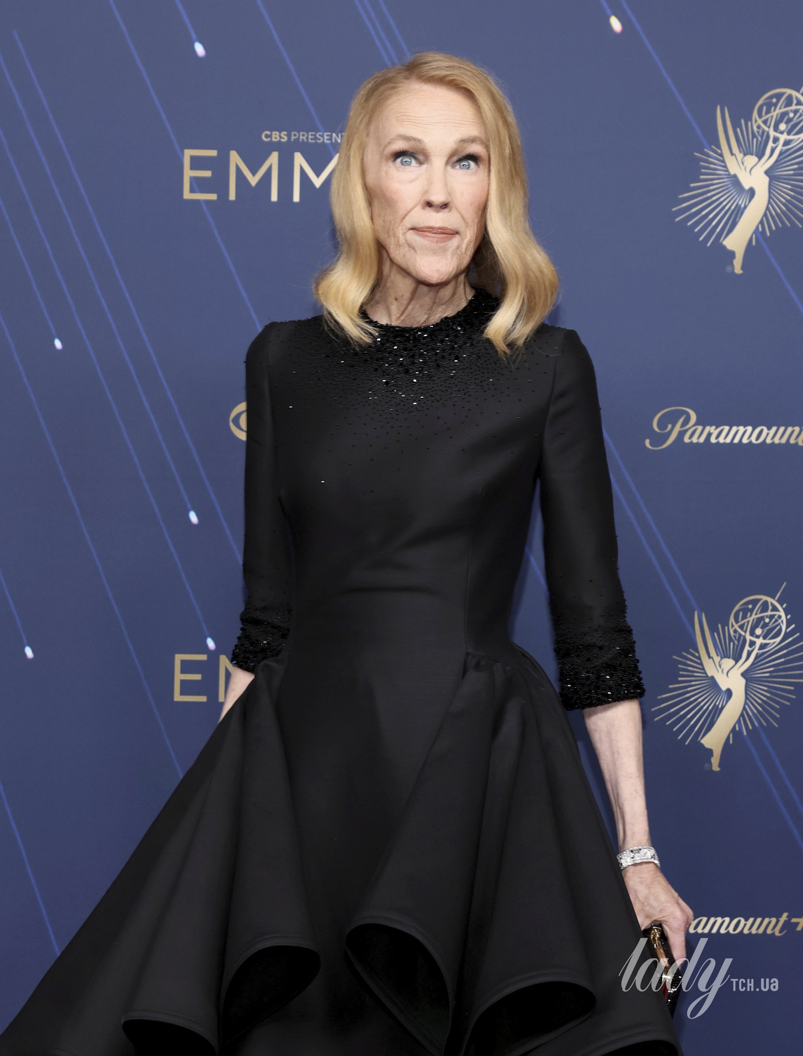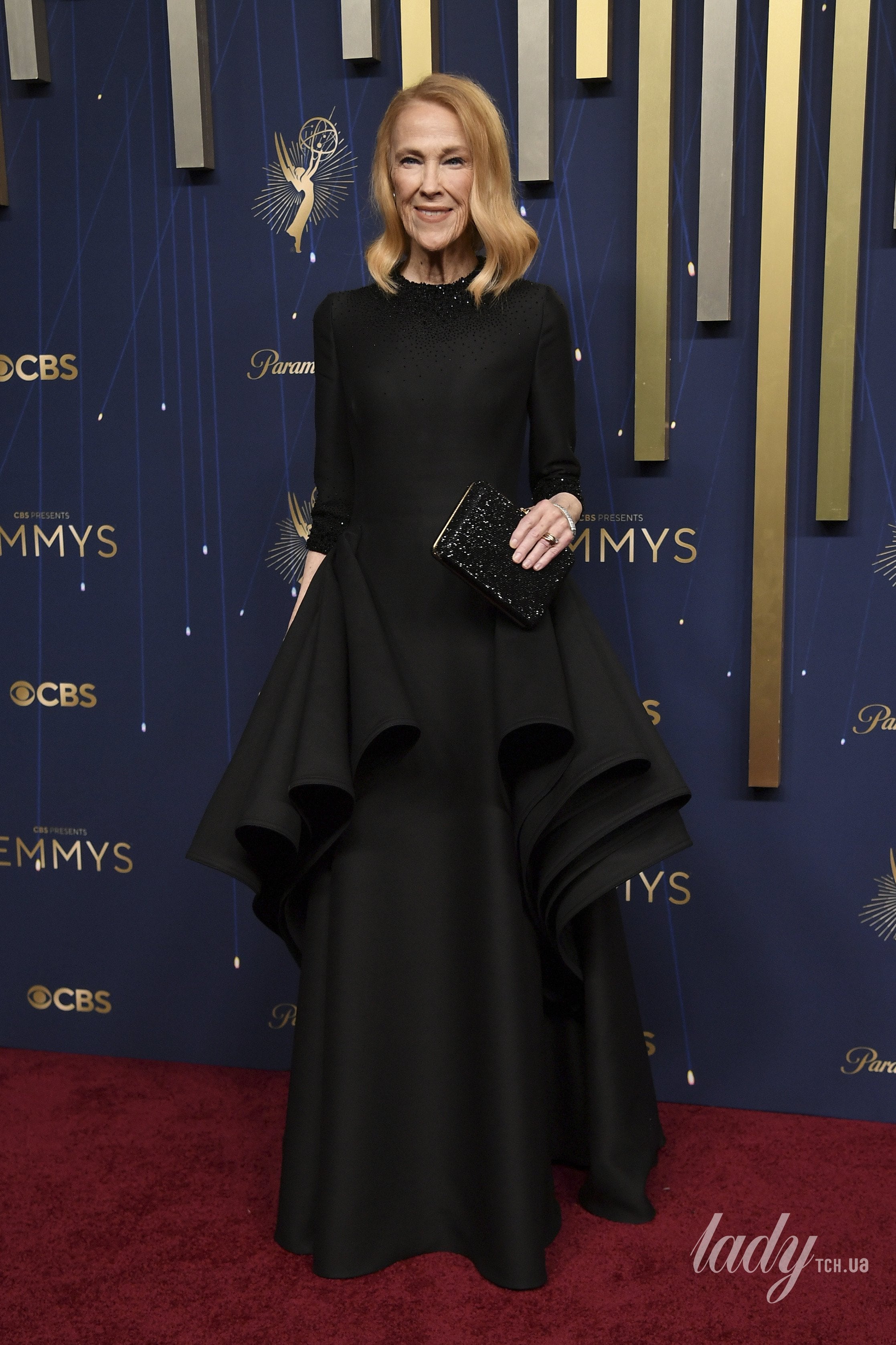 Аутфіт О’Гара доповнила чорним блискучим клатчем. У неї було хвилясте укладання, макіяж із бежевою помадою і золоті прикраси з діамантами.