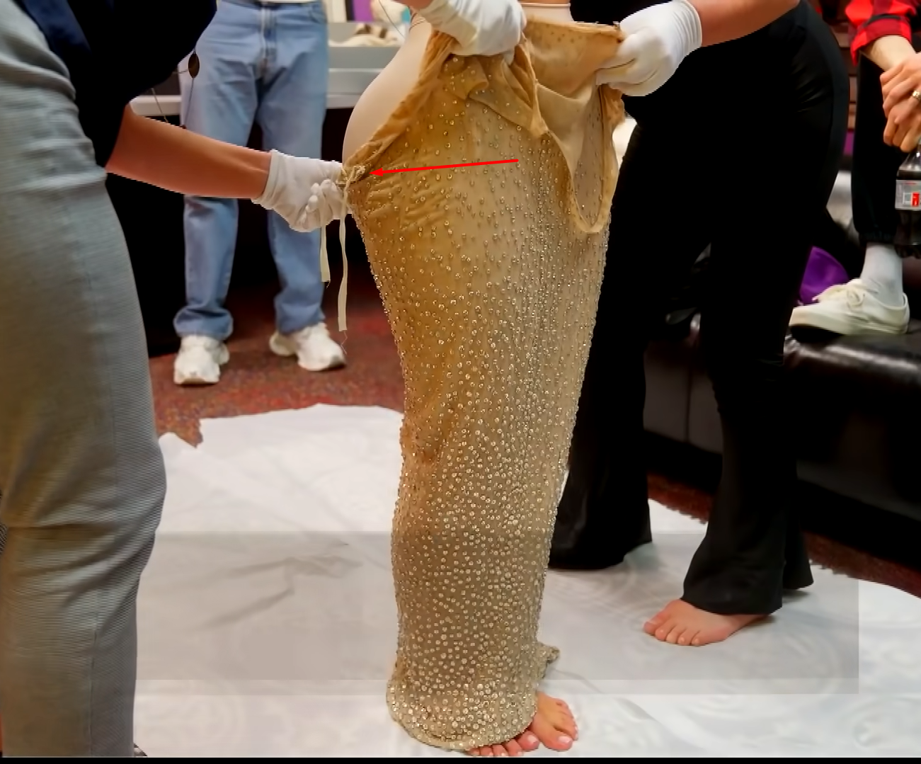 Уперше шкоду помітив історик і колекціонер Скотт Фортнер, який опублікував у The Marilyn Monroe Collection знімки сукні, зроблені фотографом Чадом Моррісеттом, і на них чітко видно, що вбрання вартістю в майже 5 мільйонів доларів назавжди пошкоджене.