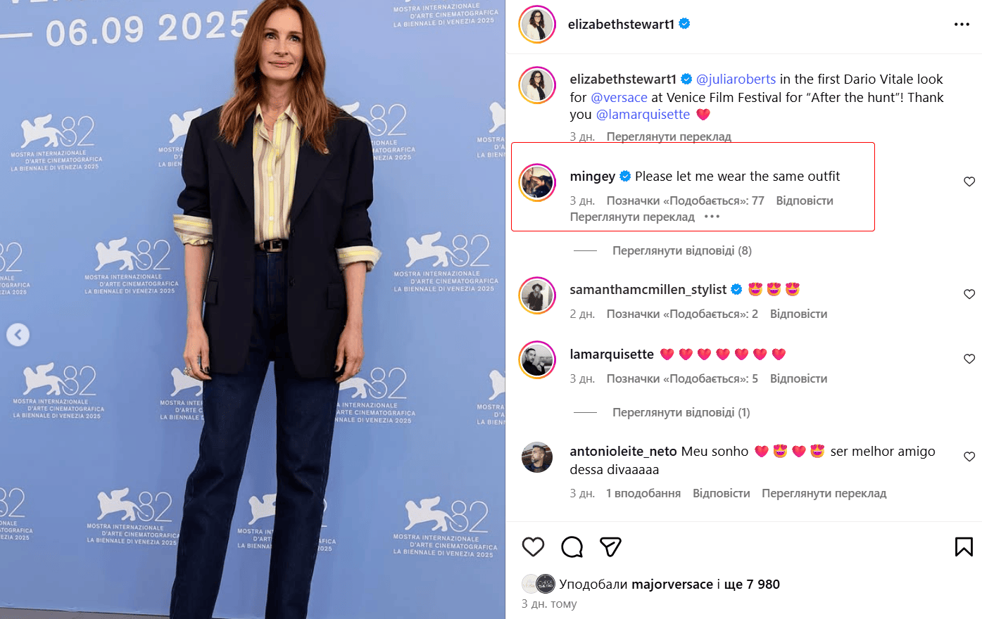 В обох акторок одна й та сама стилістка — Елізабет Стюарт, і коли вона опублікувала в Instagram світлину Джулії в луку від Versace, один із перших коментарів залишила Сейфрід, яка благала стилістку повторити цей образ для неї.