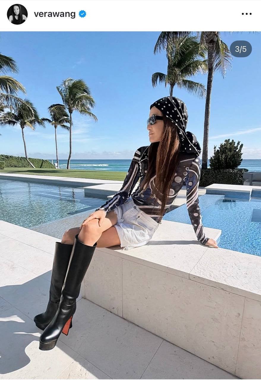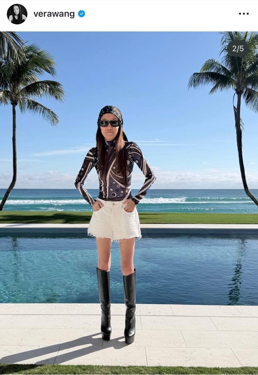 Відома американська дизайнерка Вера Вонг любить підкреслювати свою струнку фігуру одягом. У своєму Instagram вона поділилася новим луком, у якому поєднала улюблені нею джинсові шорти і взуття на високих підборах — у цьому разі високі шкіряні чоботи на платформі.