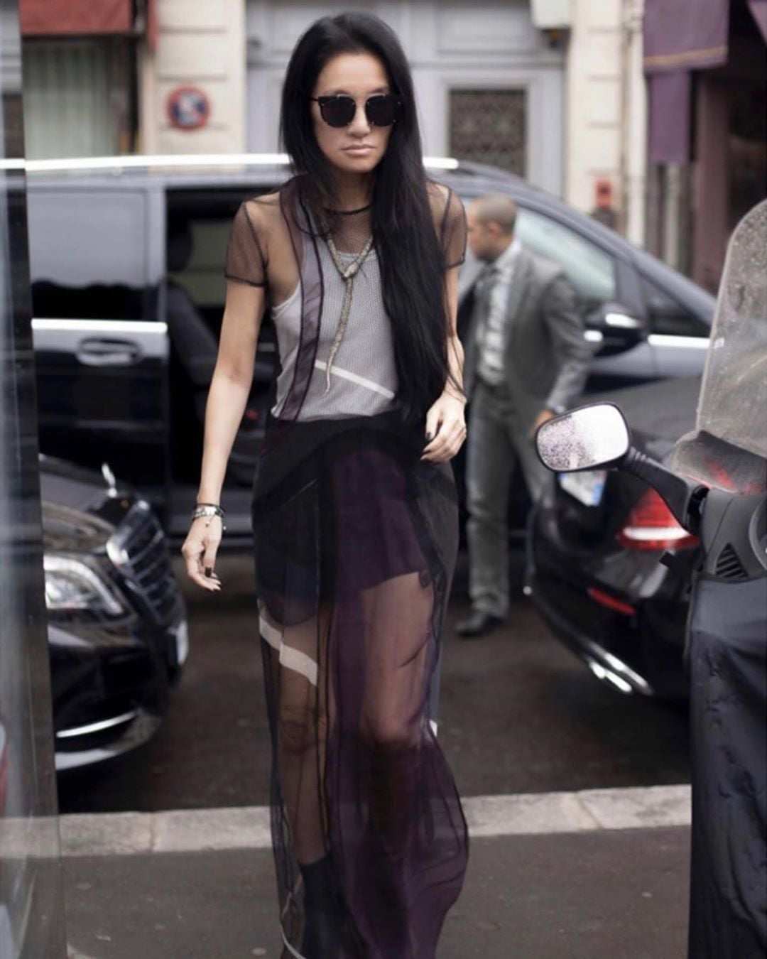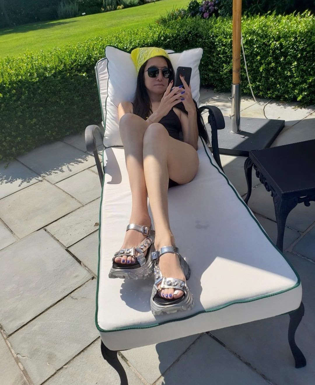 Також вона була одягнена в тонкий топ із принтом, на її голові була хустка в дрібний горох, а на обличчі — чорні сонцезахисні окуляри.