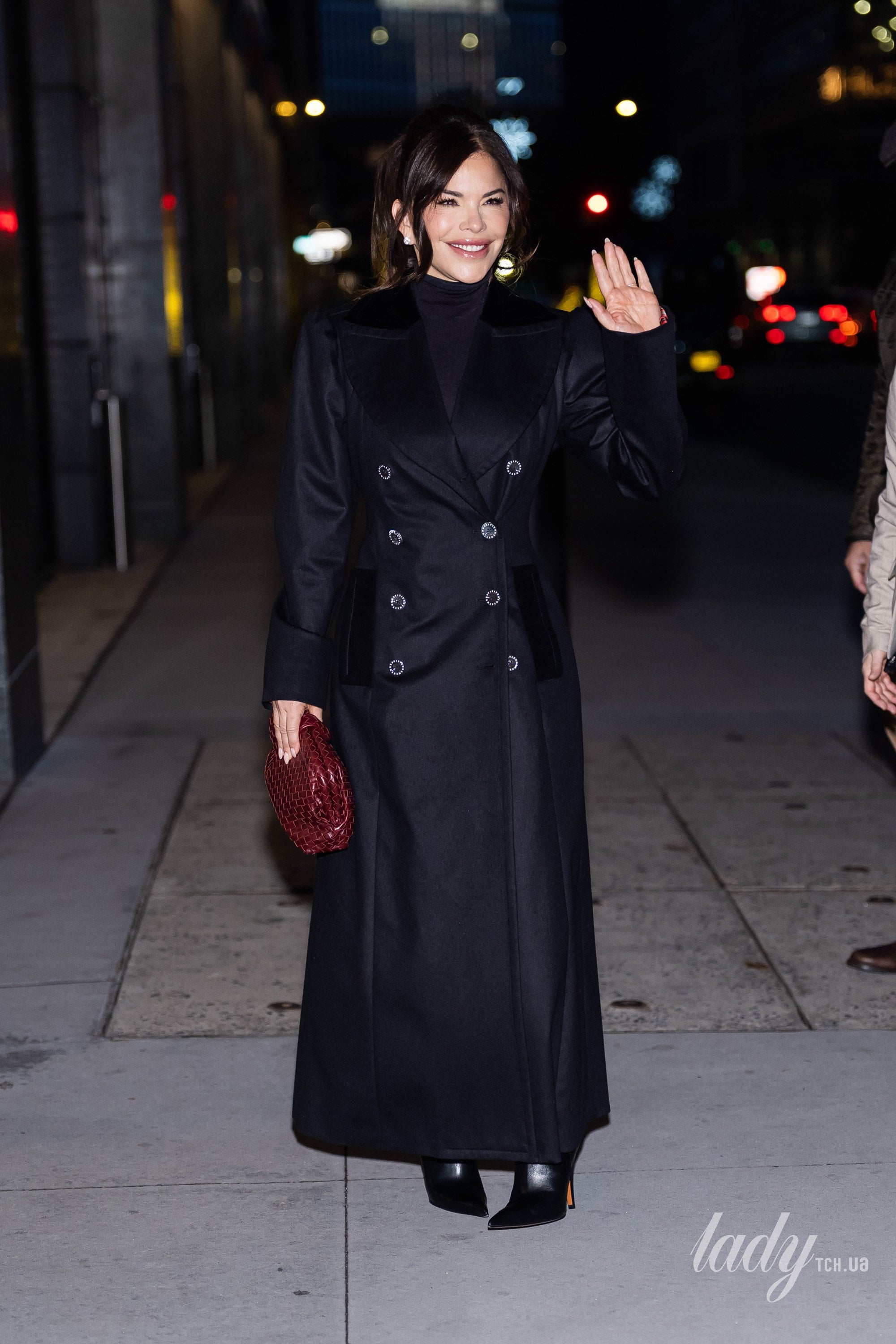 Для телевізійної появи Лорен обрала лаконічну чорну водолазку та довге пальто з ґудзиками, широкими лацканами та складками на спині, але також дружина мільярдера була одягнена в гостроносі чоботи від McQueen на високих підборах.