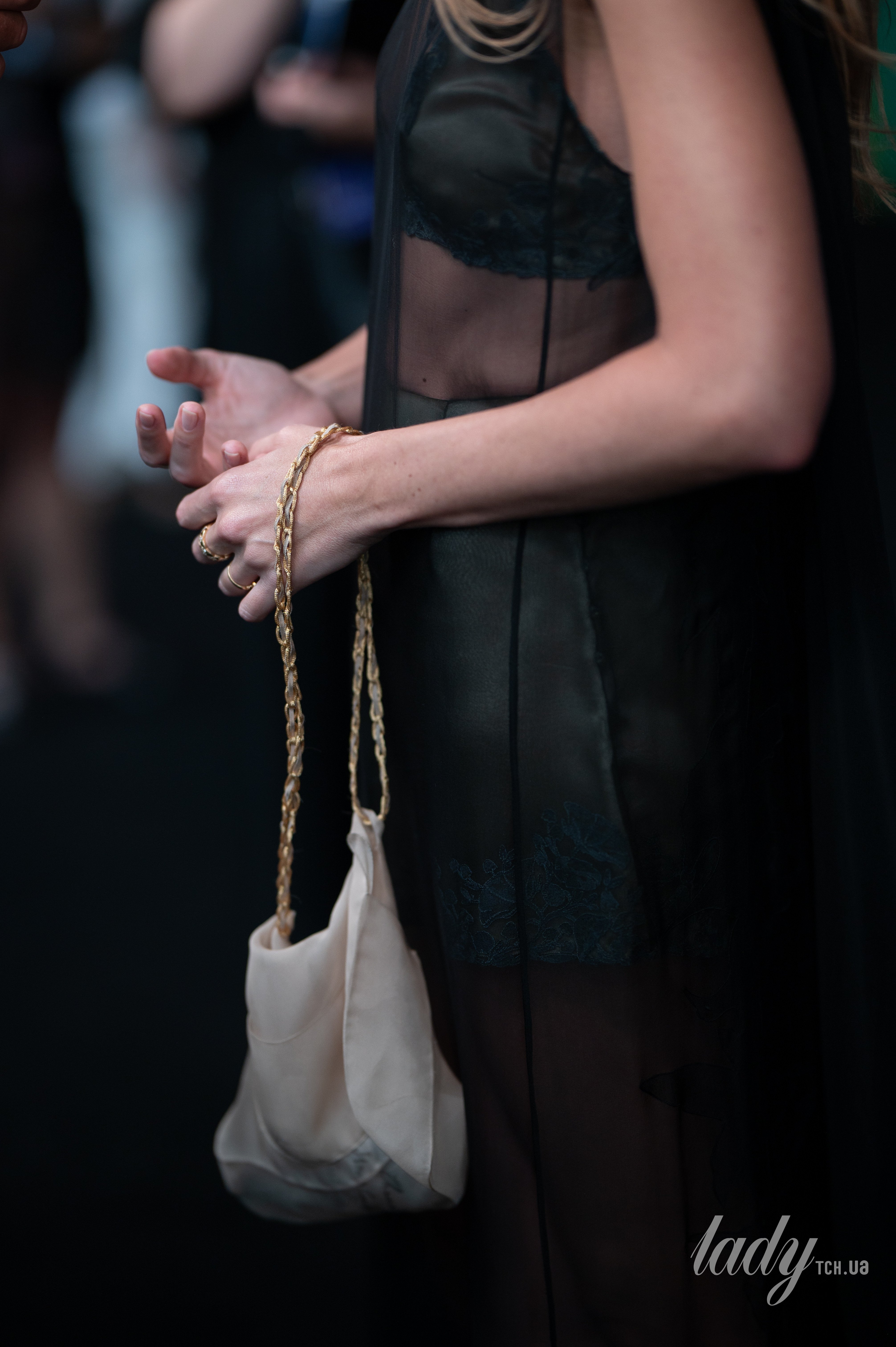 Також Марго доповнила сукню чорними туфлями Chanel з відкритою п’яткою, лаконічними прикрасами і легким денним макіяжем, який підкреслював її природну красу. Однак була у цьому луку ще одна деталь — у руці Марго тримала незвичайну сумку, яку Блазі також презентував під час Тижня моди.