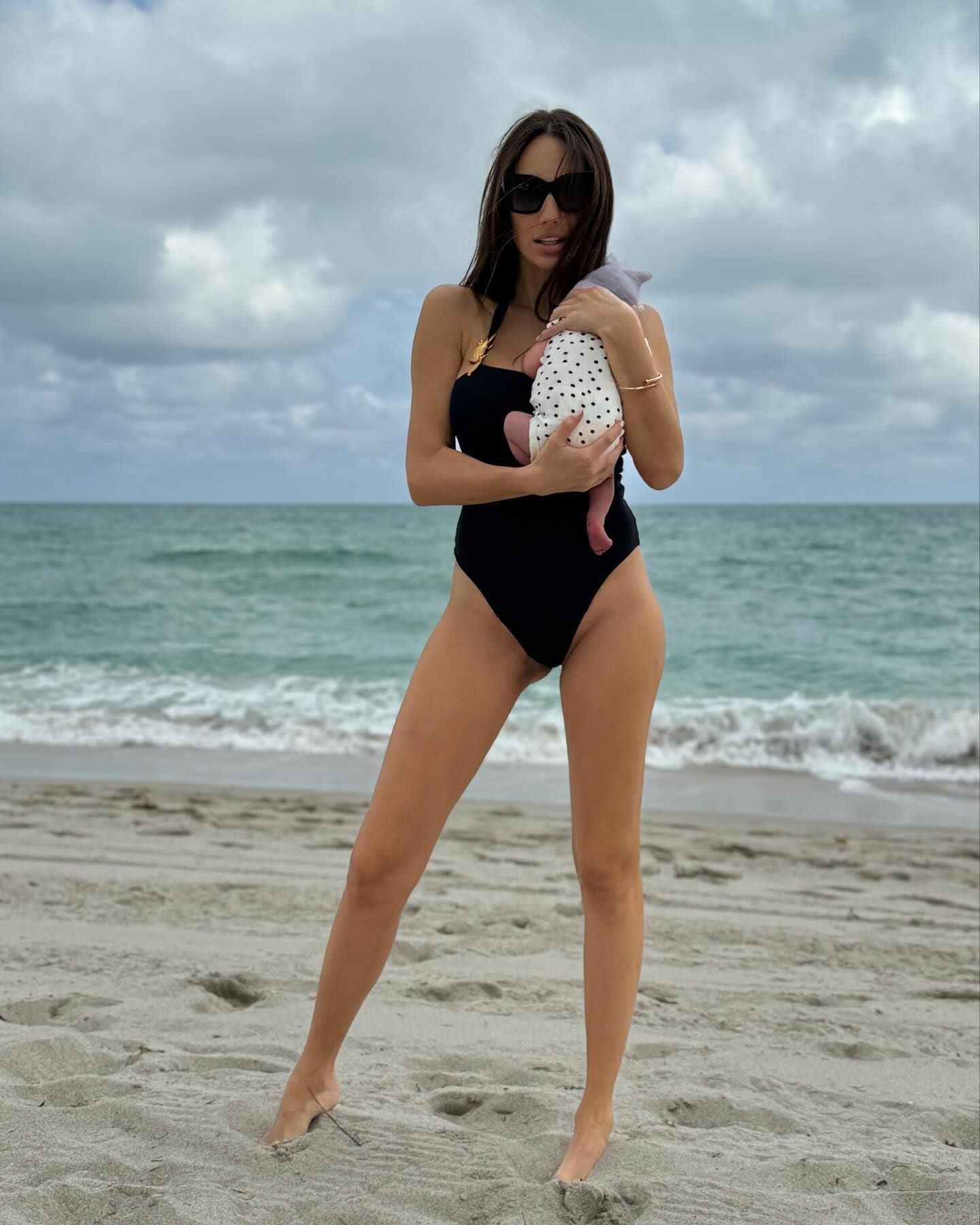 Вікторія позувала з малям на руках на пляжі. Одягнена вона була у чорний суцільний купальник. Варлей продемонструвала просто неймовірно розкішну форму після пологів. Її фігура така струнка, що навіть і не скажеш, що вона народжувала майже 3 тижні тому.