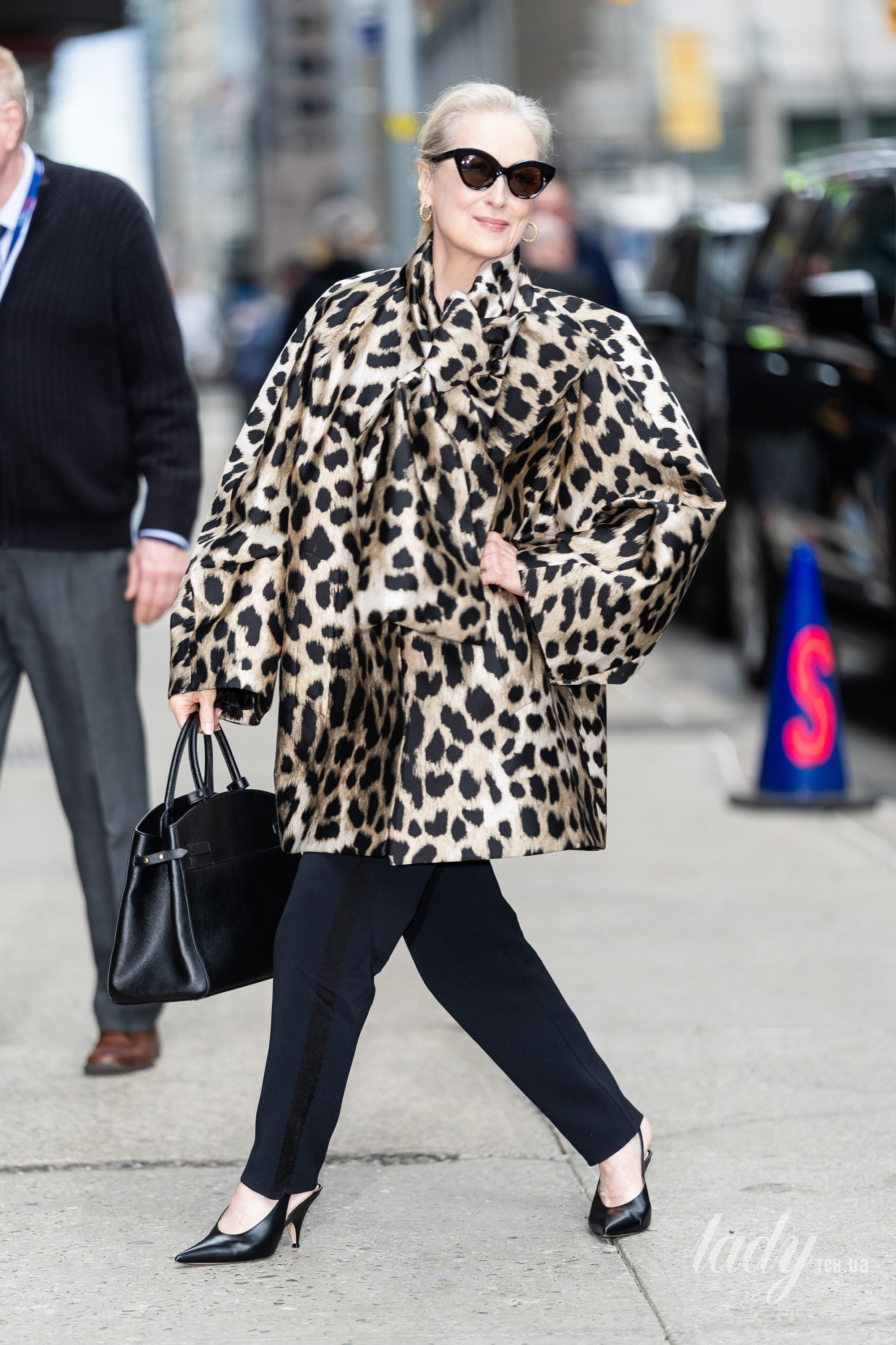 Цього разу вибір акторки був яскравим, адже вона поєднала оверсайз пальто з леопардовим принтом, що мало широкі рукави та ефектний комір-бант, з класичними чорними штанами. Вбрання Меріл було від Givenchy, а підібрала його стилістка Мікаела Ерлангер.