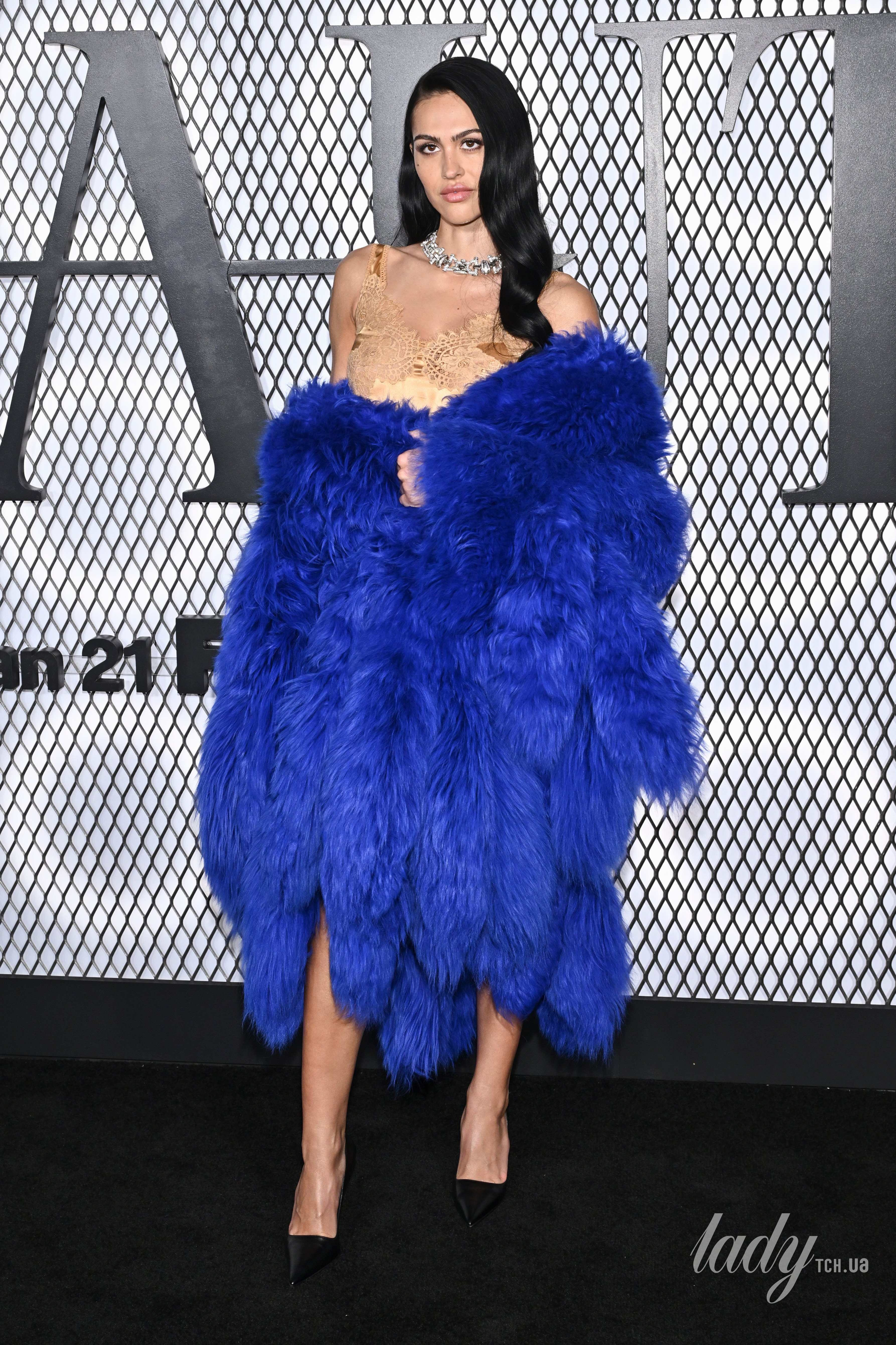Однак головним яскравим акцентом образу стала об’ємна шуба дівчини насиченого кобальтового відтінку. Також красуня доповнила образ масивним гламурним кольє, гостроносими туфлями, яскравим макіяжем і зачіскою із елегантно вкладеним у хвилі волоссям.