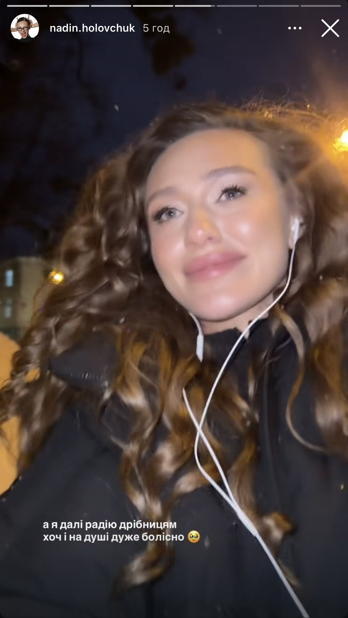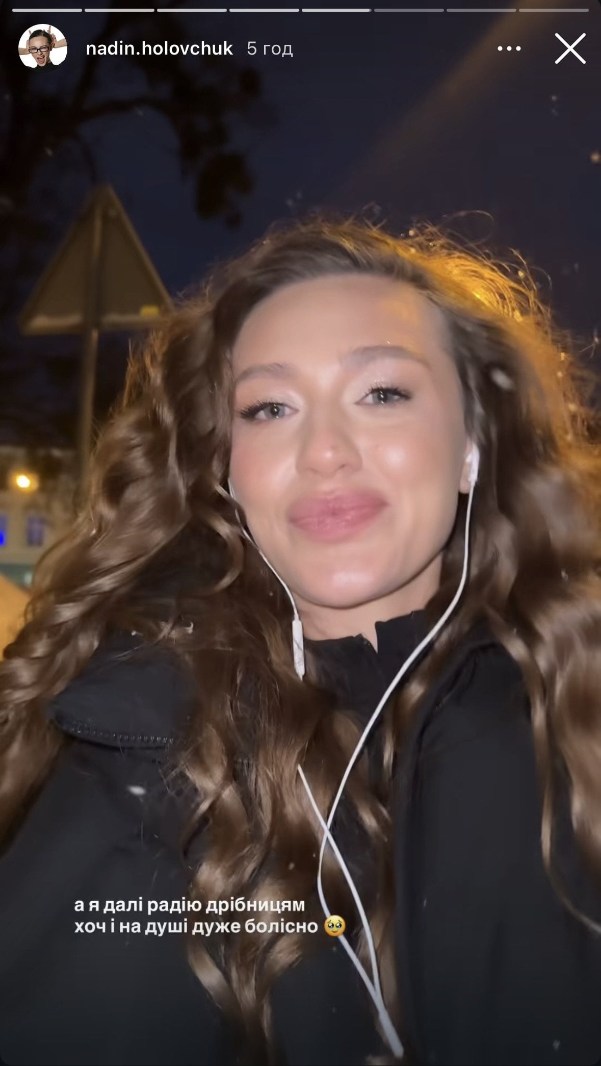 А справа в тому, що на відео дівчина з’явилася зі сльозами на очах. Надін нічого не говорила, але лише коротко написала: «А я далі радію дрібницям, хоч і на душі дуже болісно».